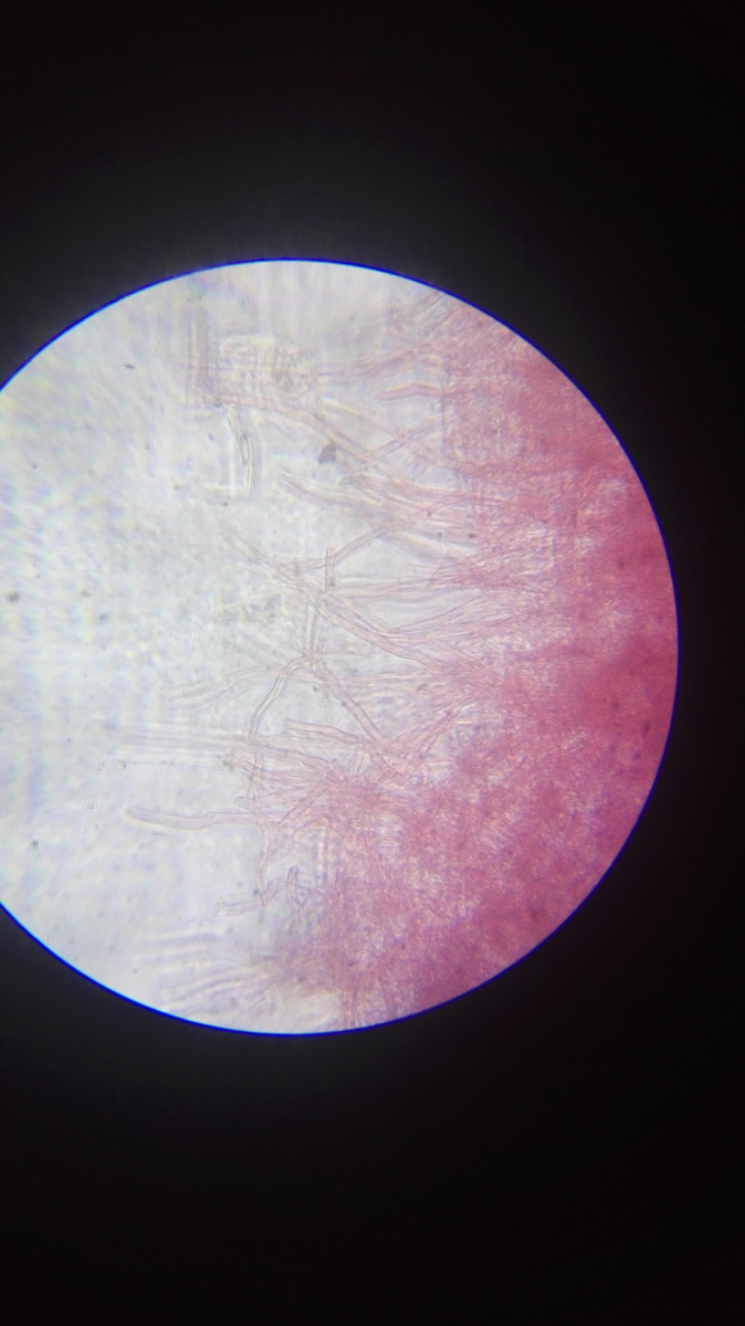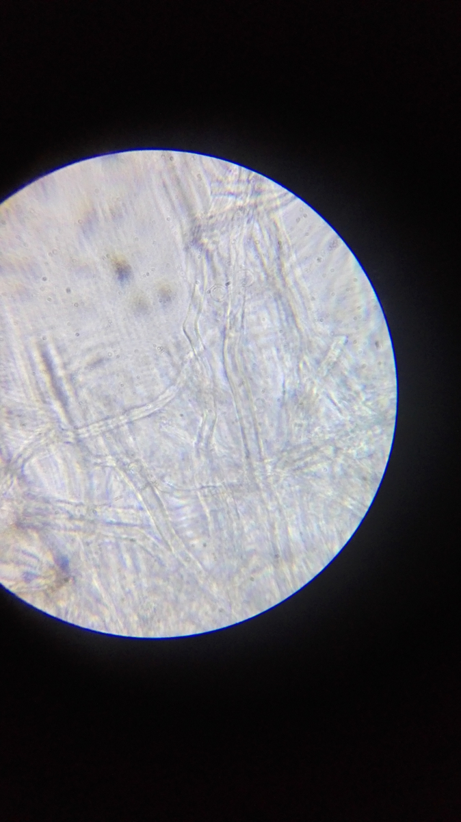 Ich füge auch meine mikrofotos bei - leider sind die recht schlecht, aber ein bisschen was sieht man, z. B. dass der pilz hyphen ohne schnallen hat.