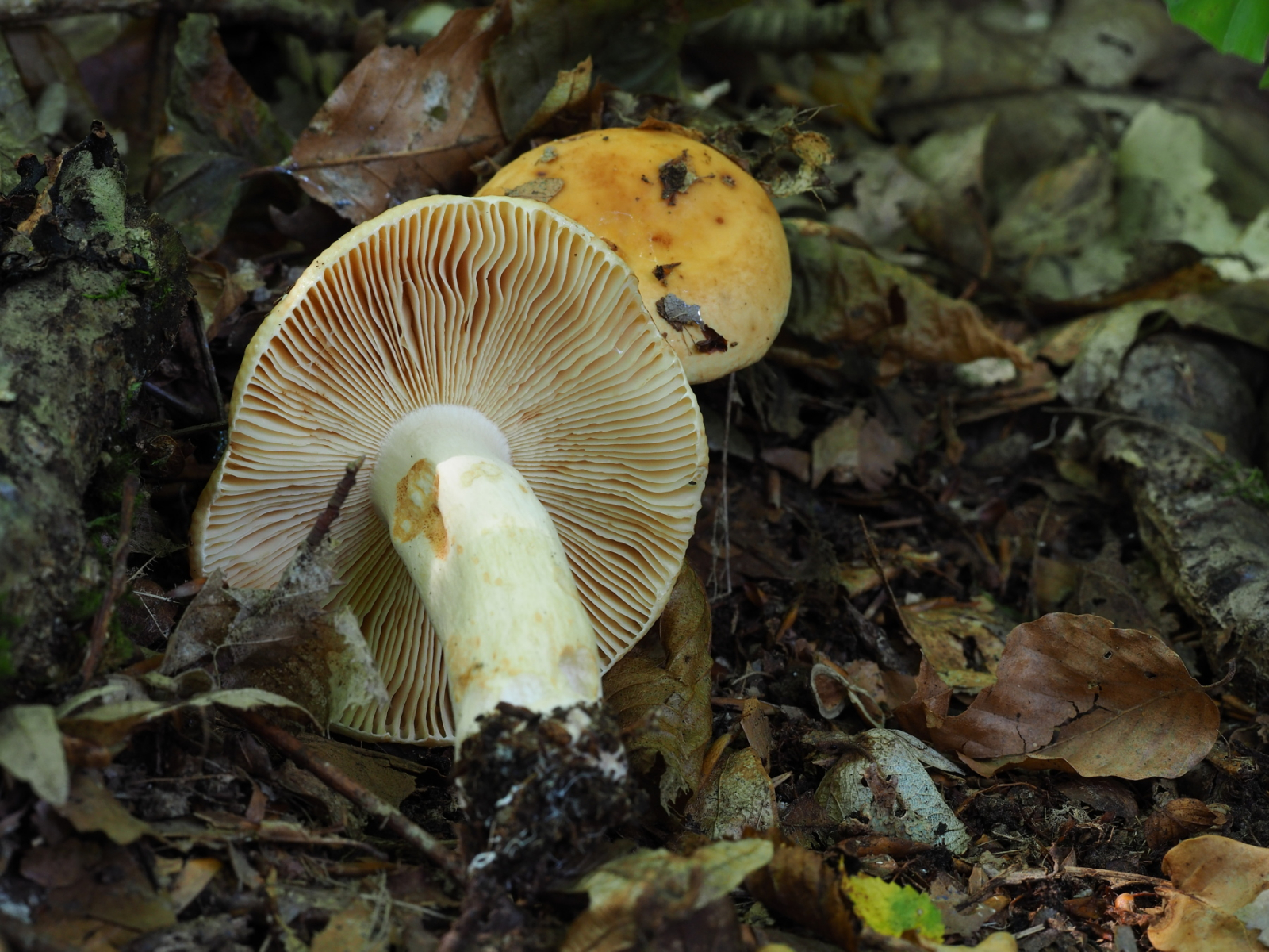 1) feuchtere Stelle im Buchen Mischwald, Hut semmelgelb, Stiel creme-gelblich getönt