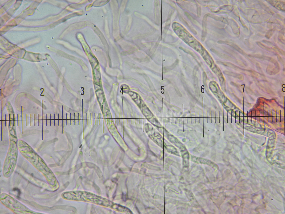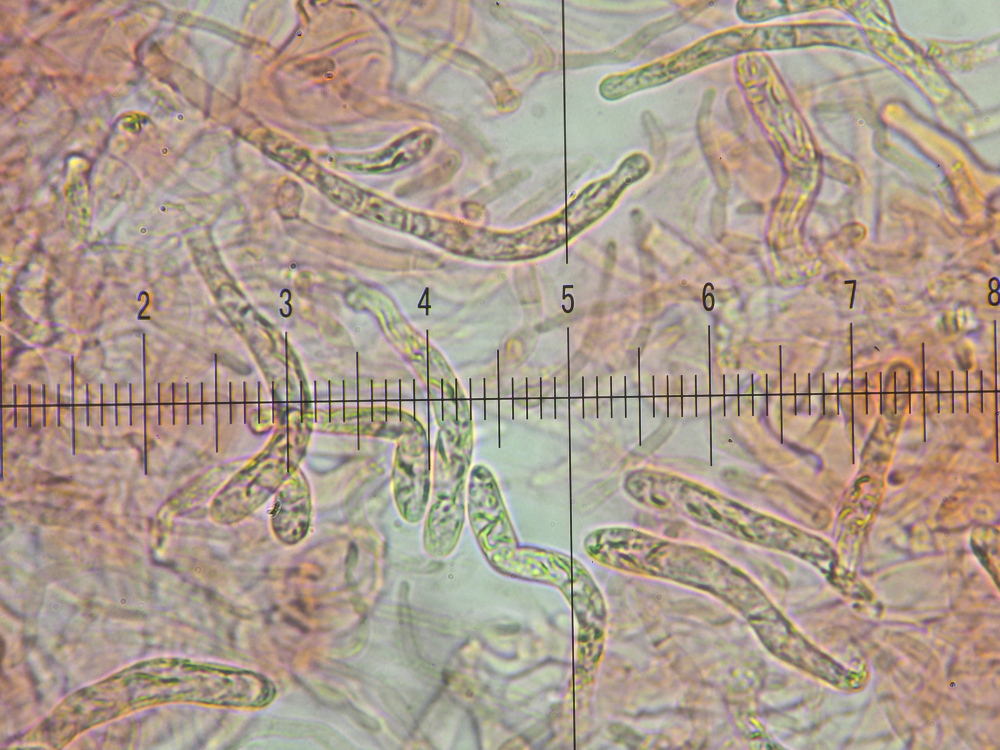 HDS Pileozystiden: vorhanden teils lang, zylindrisch, keulig, kopfig, apikal verengt, 0-2x septiert, 9 µm breit, grau-schwarz in Sulfovanillin