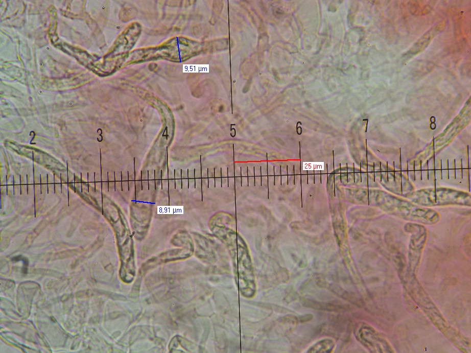 7) 400x, HDS, KOH 3% + Kongo NH3, Zystiden Breite bis 9,5 µm