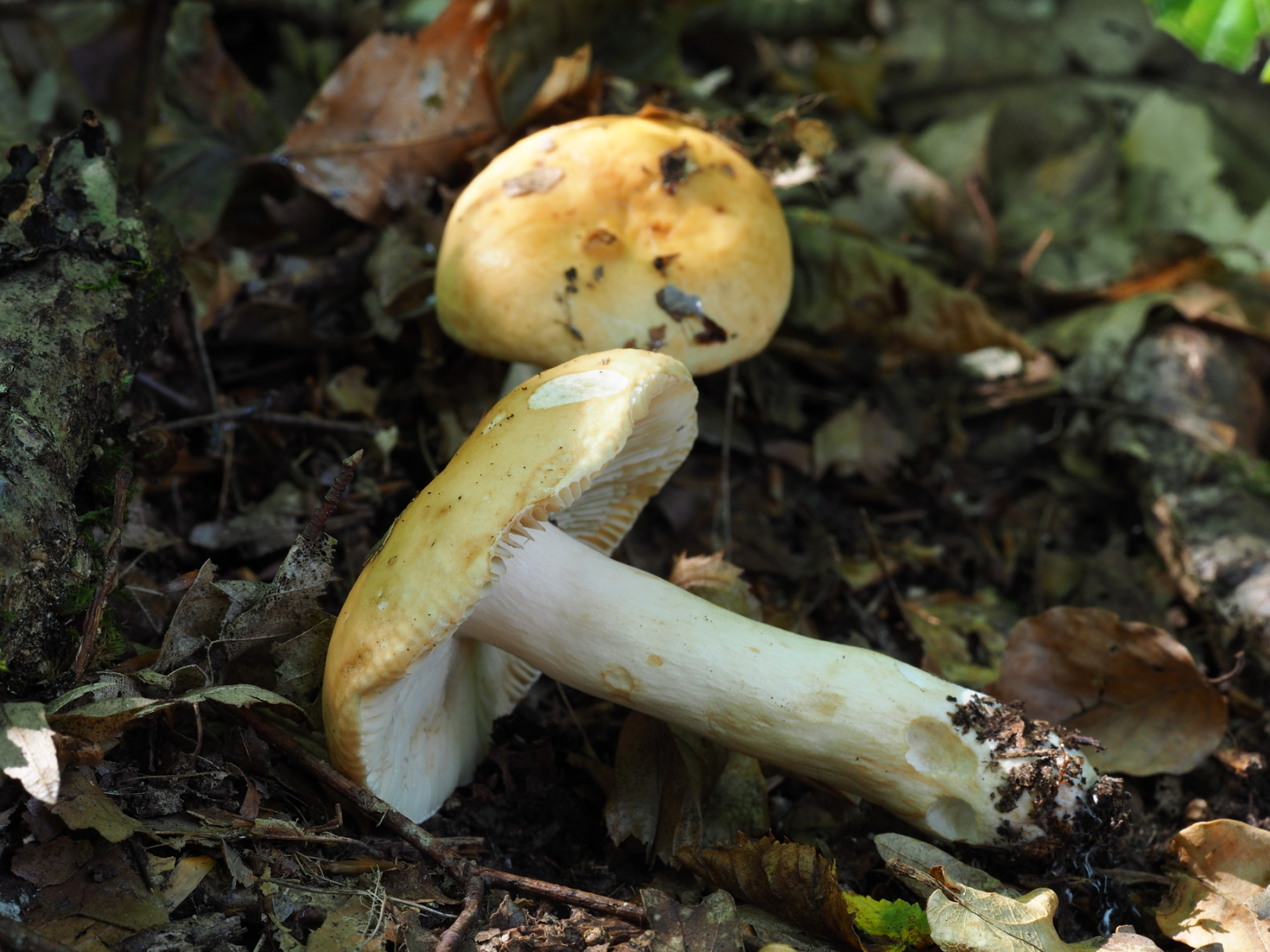 1) feuchtere Stelle im Buchen Mischwald, Hut semmelgelb, Stiel creme-gelblich getönt