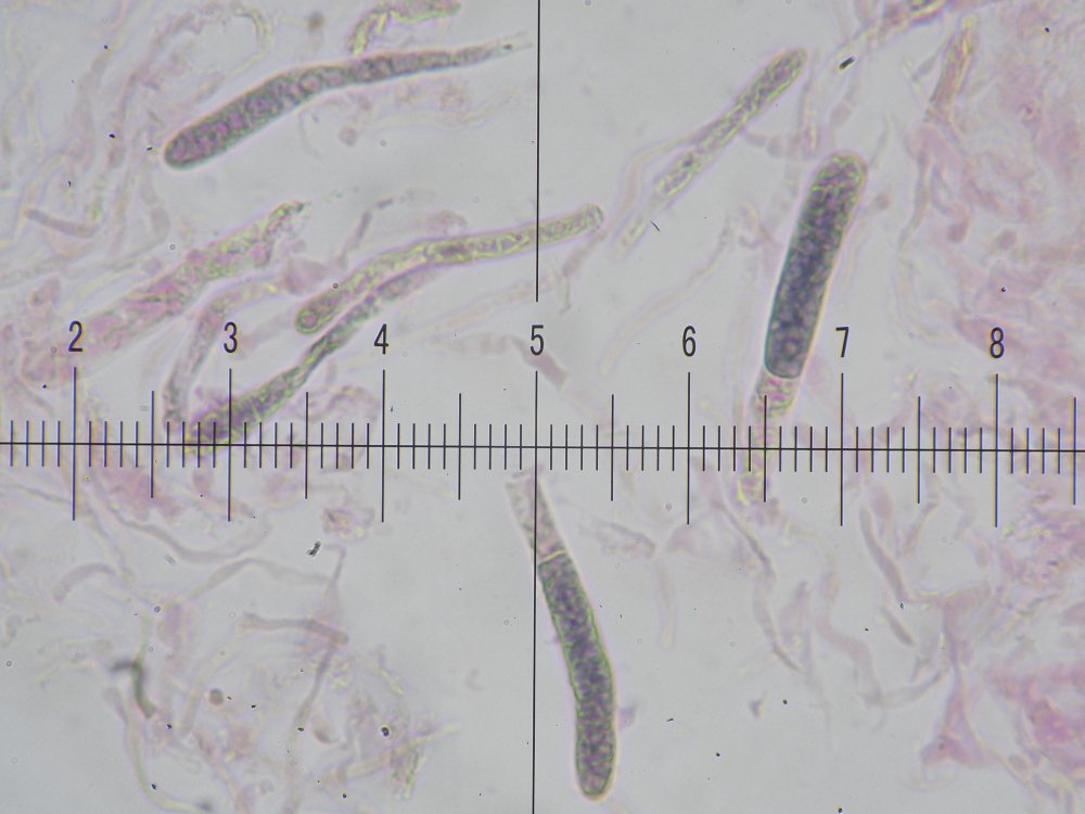 HDS Pileozystiden: vorhanden teils lang, zylindrisch, keulig, kopfig, apikal verengt, 0-2x septiert, 9 µm breit, grau-schwarz in Sulfovanillin