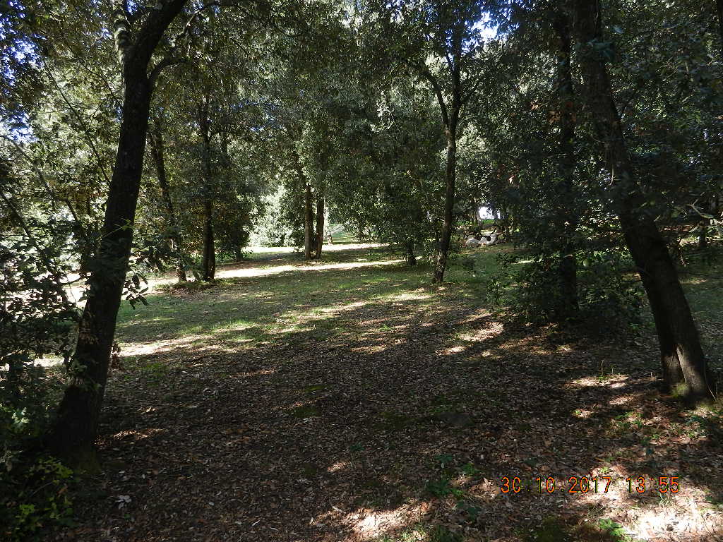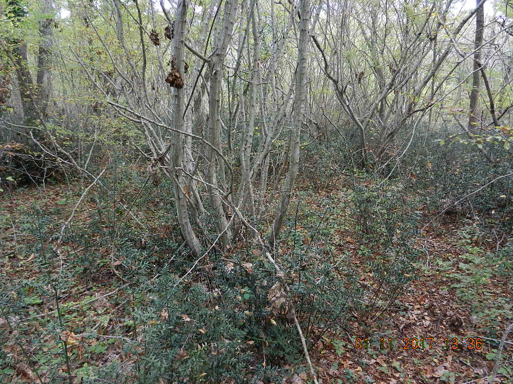 Laubabwerfender Eichenwald (Zerreiche, bot. Name?) mit dichter Krautschicht aus Mäusedorn (eine Art Stechpalme) oberhalb einer Ferienwohnungsanlage (ca. 20 m NN)