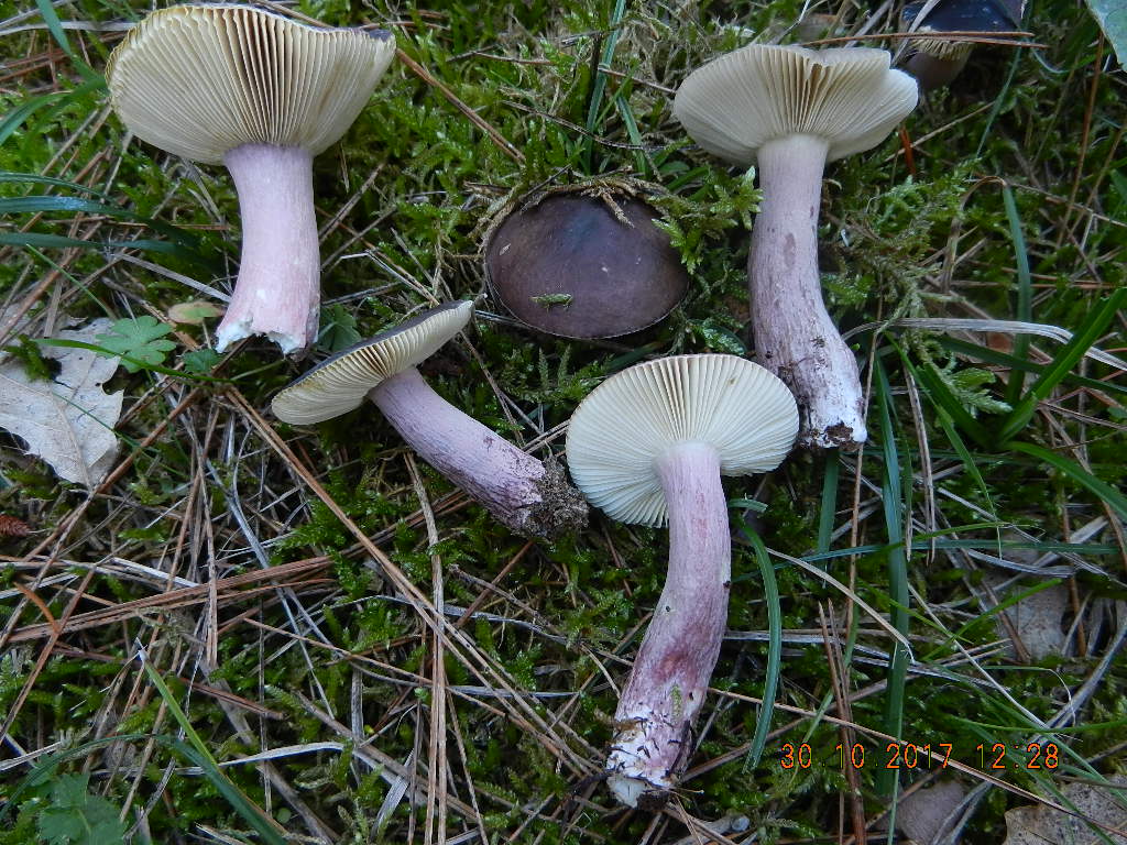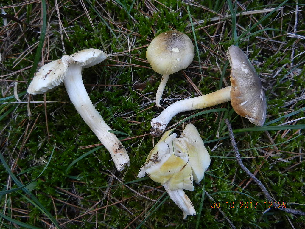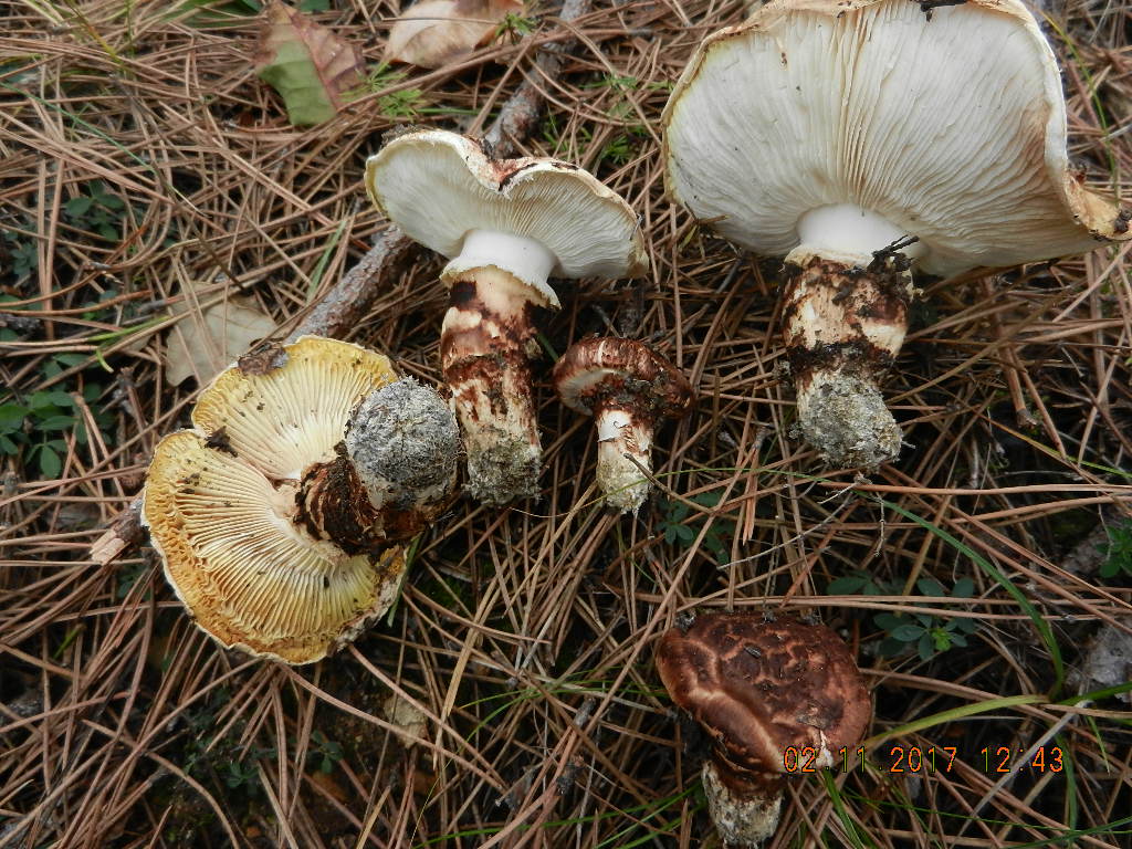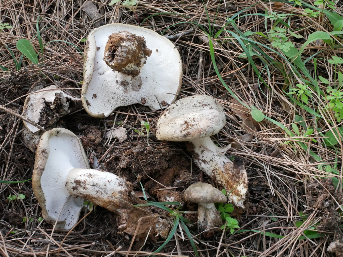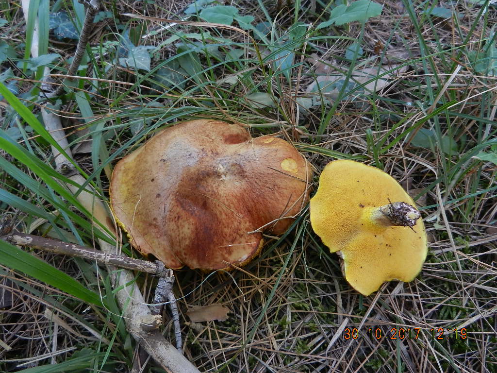 Der mit Abstand häufigste Pilz in den dortigen Kiefernwäldern, egal ob am Meer oder in der Höhenlage: Ringloser Butterpilz (Suillus collinitus), erkennbar an der striaten Hutoberfläche (eingewachsene braune Radialfasern) und der blassrosa Stielbasis: