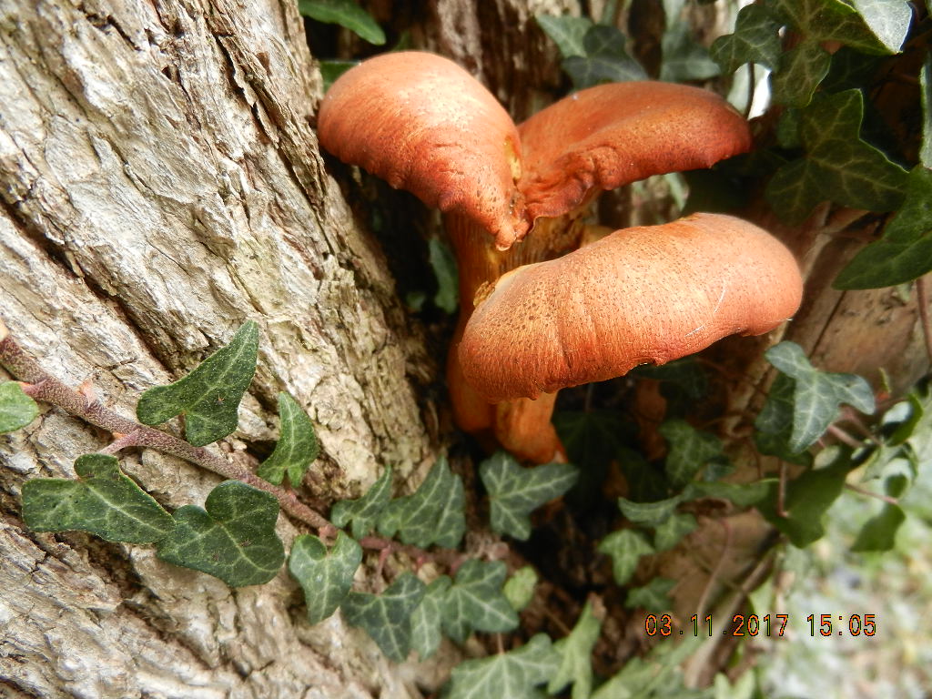 Leuchtender Ölbaumtrichterling (Omphalotus illudens), das Leuchten wurde nachts in der Herberge überprüft: