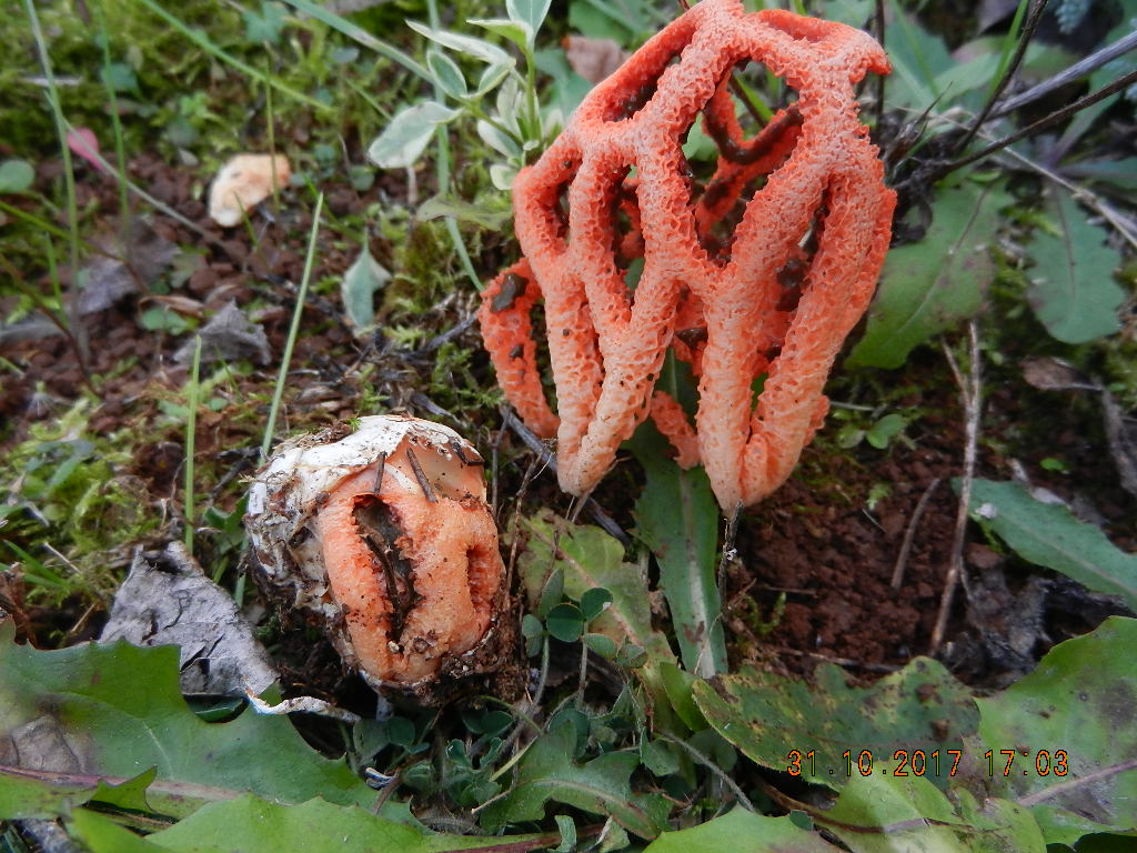 Der durfte natürlich nicht fehlen: Gitterling (Clathrus ruber), gewachsen im Strandkiefernwald unter dicken Nadelpaketen. Dank der leuchtenden Farbe entlarvte er sich aber trotzdem: