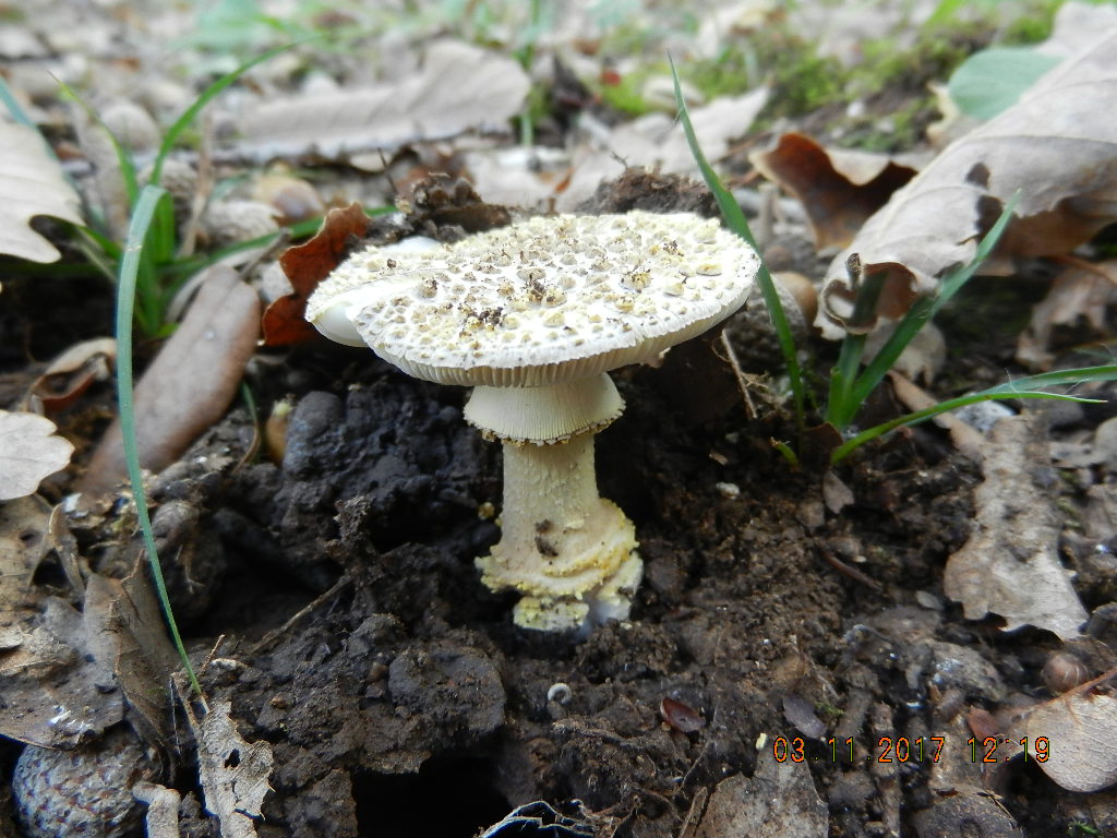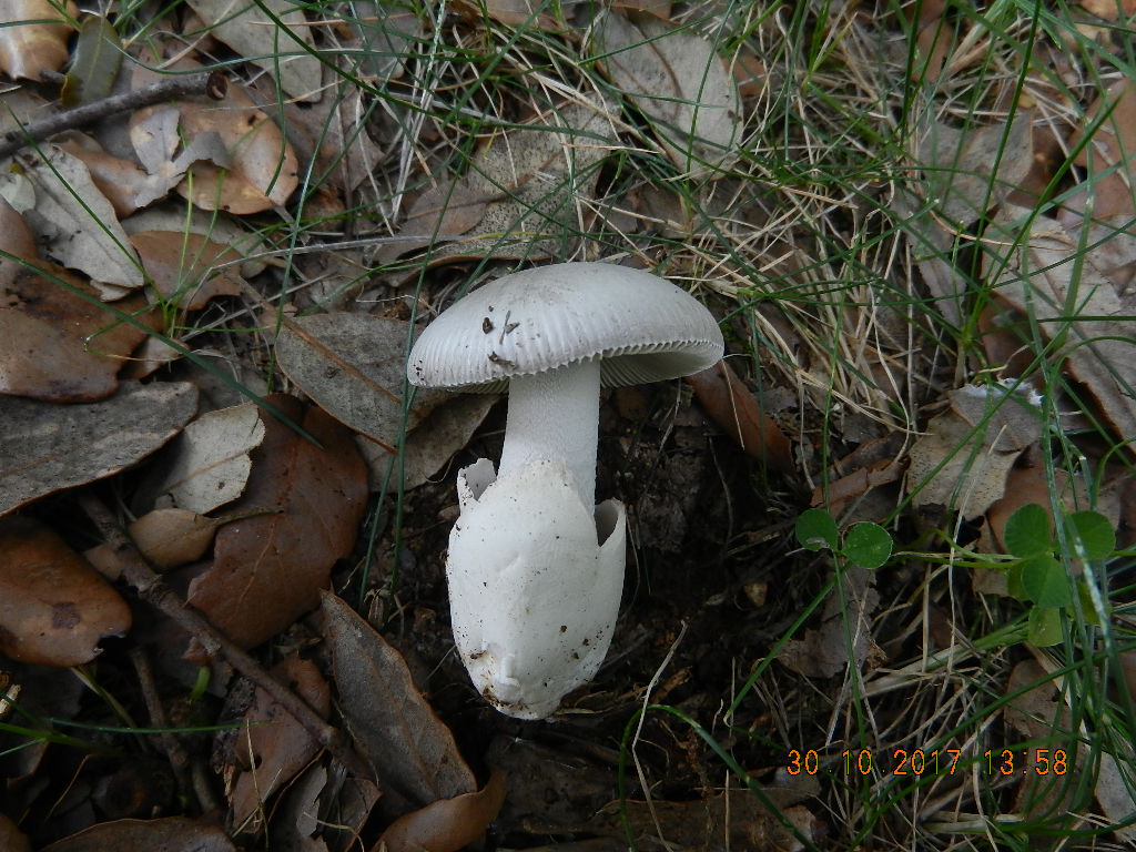 Eierwulstling (Amanita ovoidea), gut erkennbar an der Größe (etwa wie ein stattlicher Fransen-Wulstling, Amanita strobiliformis) und an den schnell auftretenden braunen Fleischverfärbungen nach Malträtieren: