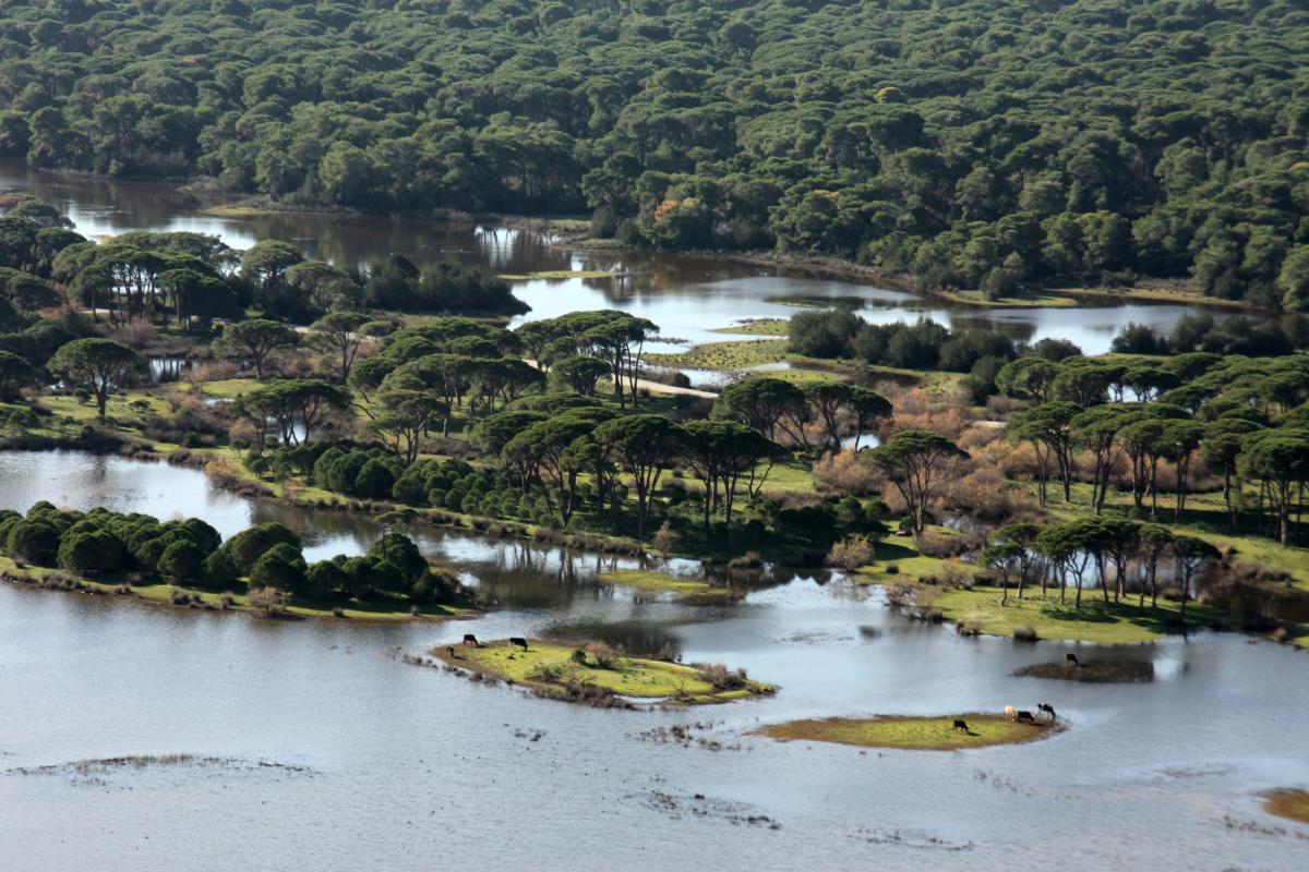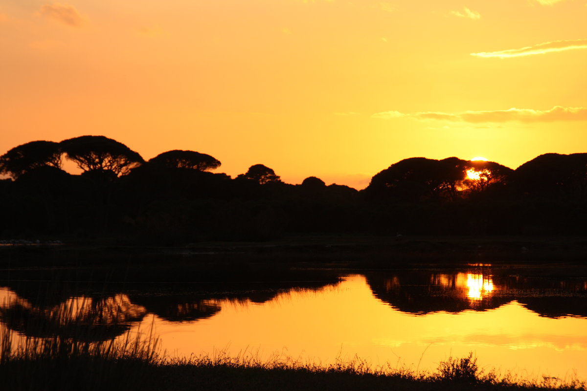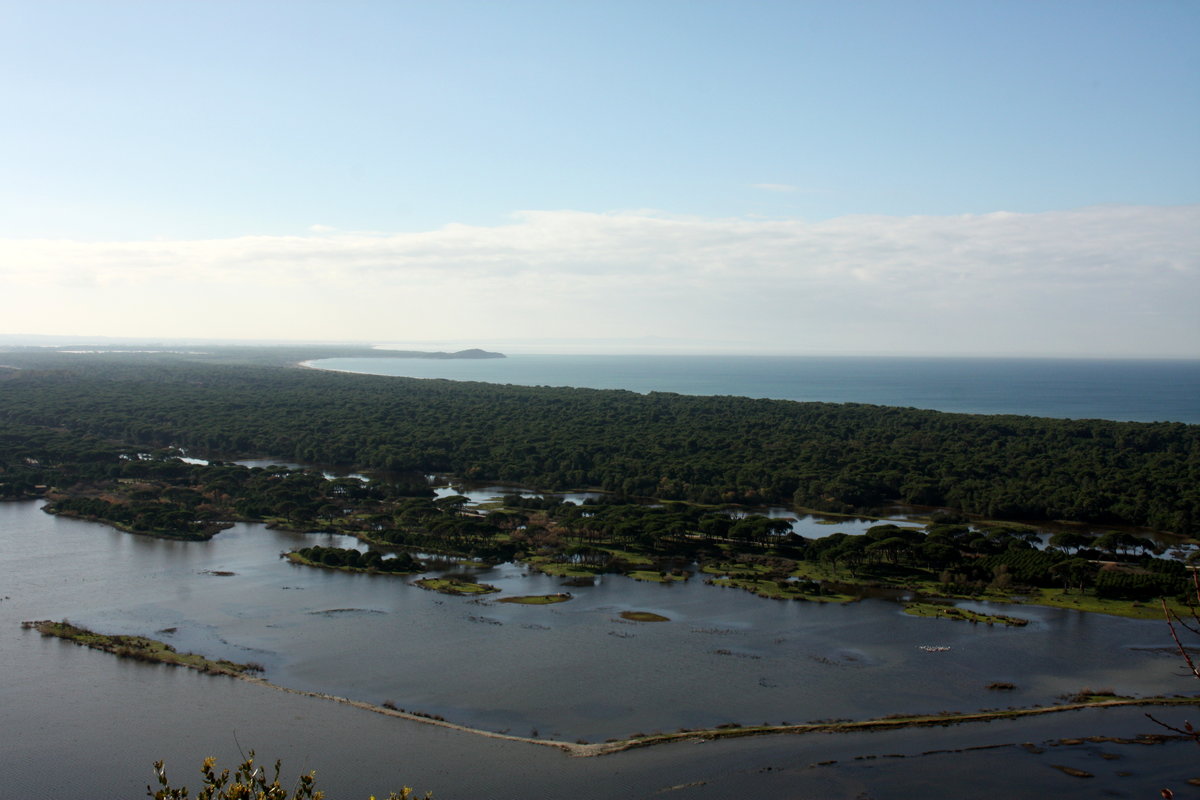 01 & 02: Blick von oben auf die Landschaft, vom nahen Berg aufgenommen: Im Vordergrund die Lagune, in der Mitte der Pinienwald, im Hintergrund das Meer. Zweites Foto: Detailaufnahme.