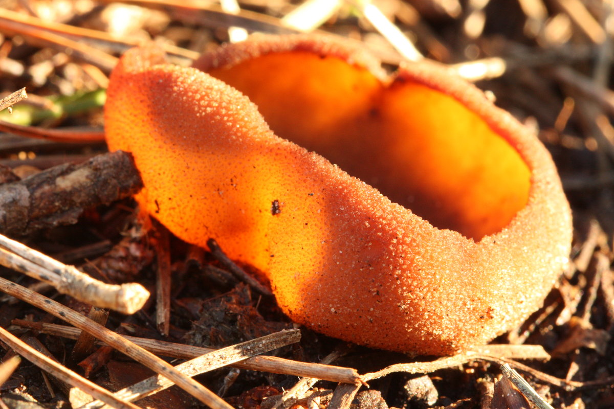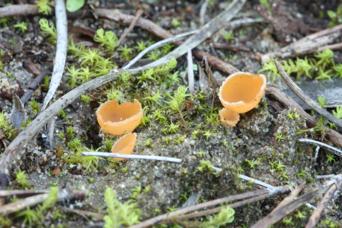 25: Kleine hübsche orange Becherchen auf Sand / Moos, 1cm maximaler Durchmesser