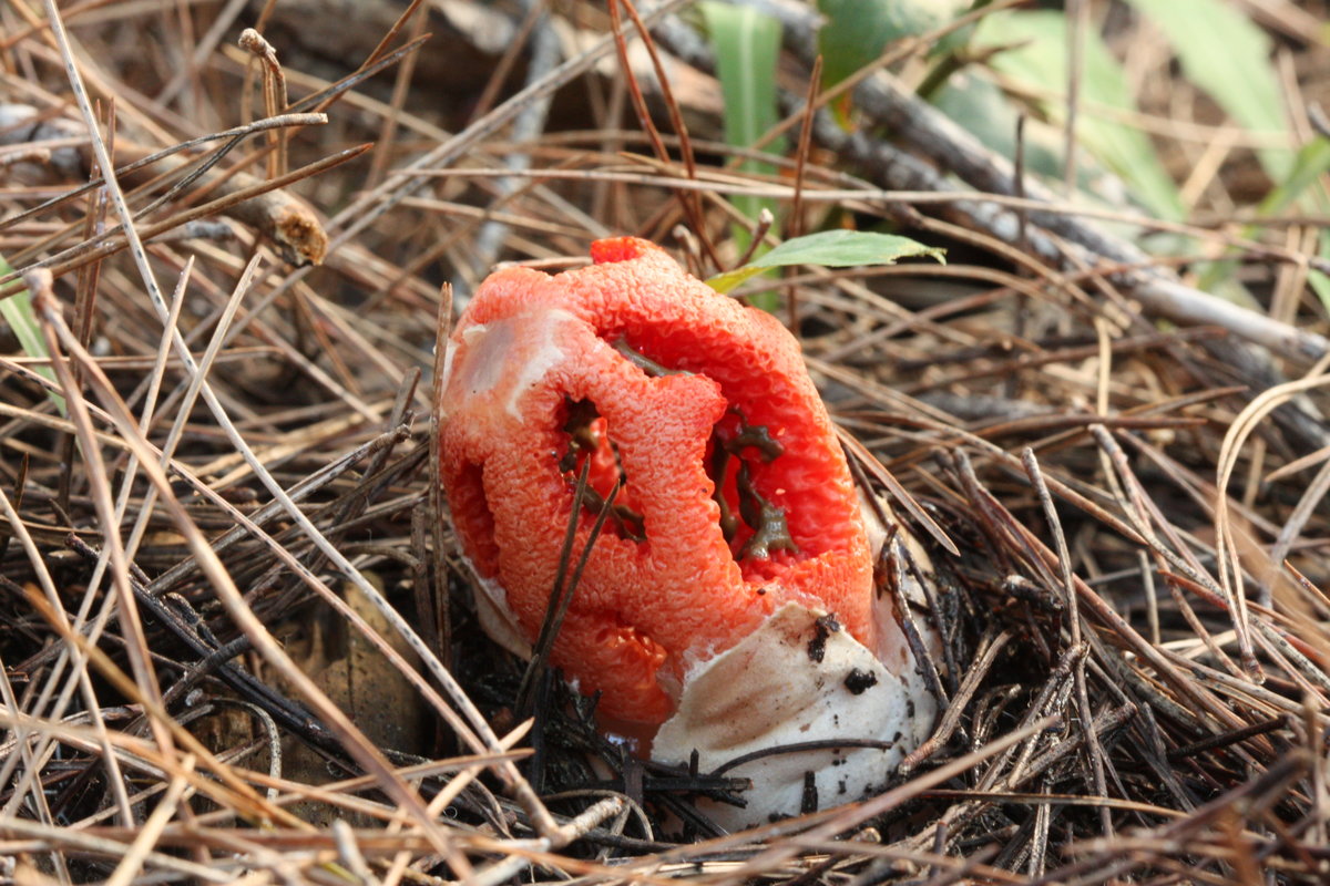 37: Rote Gitterlinge (Clathrus ruber) wagen sich auch schon hervor. Der erscheint normalerweise erst im März.