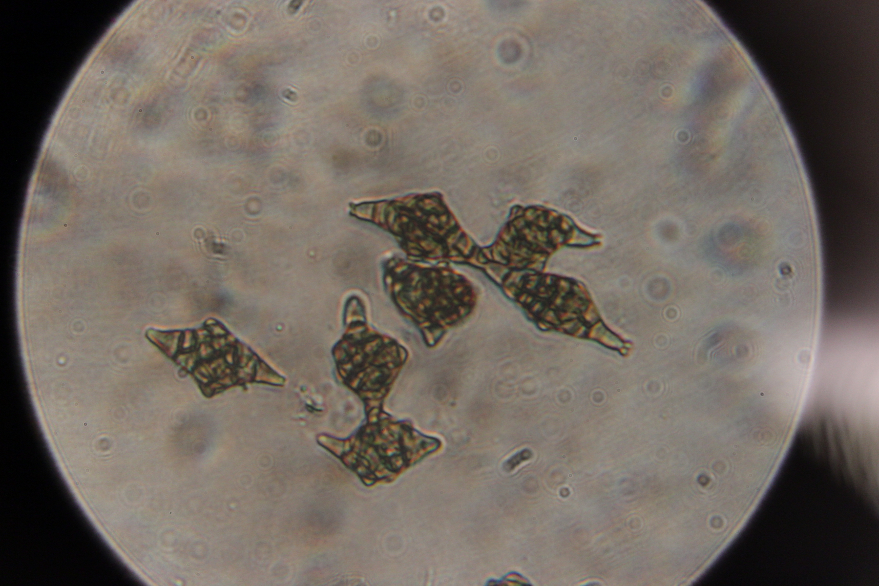 Die Sporen Form finde ich her passender für P. aurea auch sind bei 8 Messungen bis auf eine die bisschen über 2 µ, waren alle unter 2 breit, keinerlei Kristalle in gesehen, aber was ich gesehen habe waren so komische lange dünne Kristalle die überall ins Präparat schimmten.