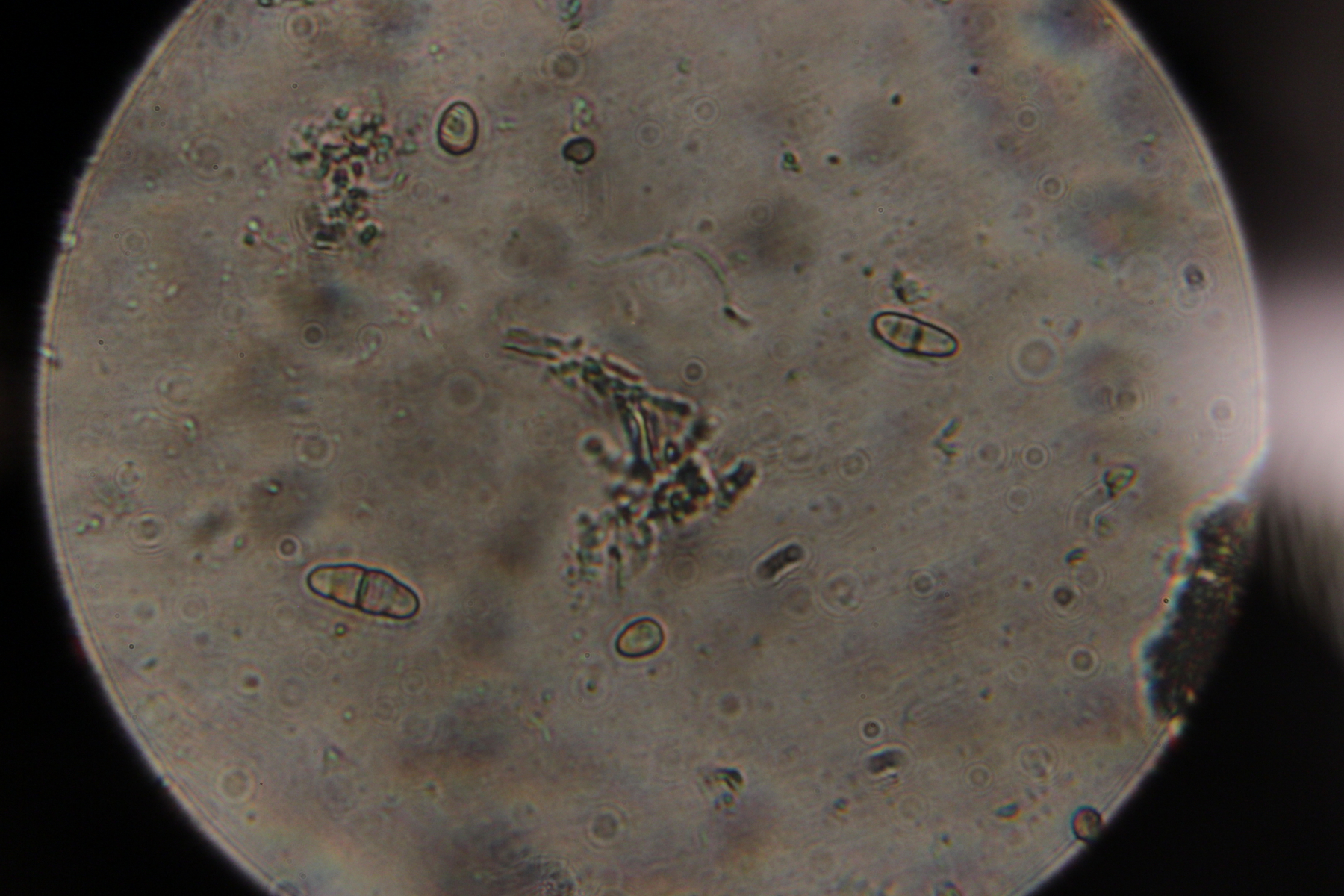 Viele Sporen sind rundlich manche ein bisschen lang gezogen, unten Rechts kann man aber sehen das die Sporen Warzig sind.