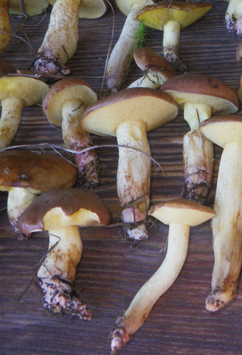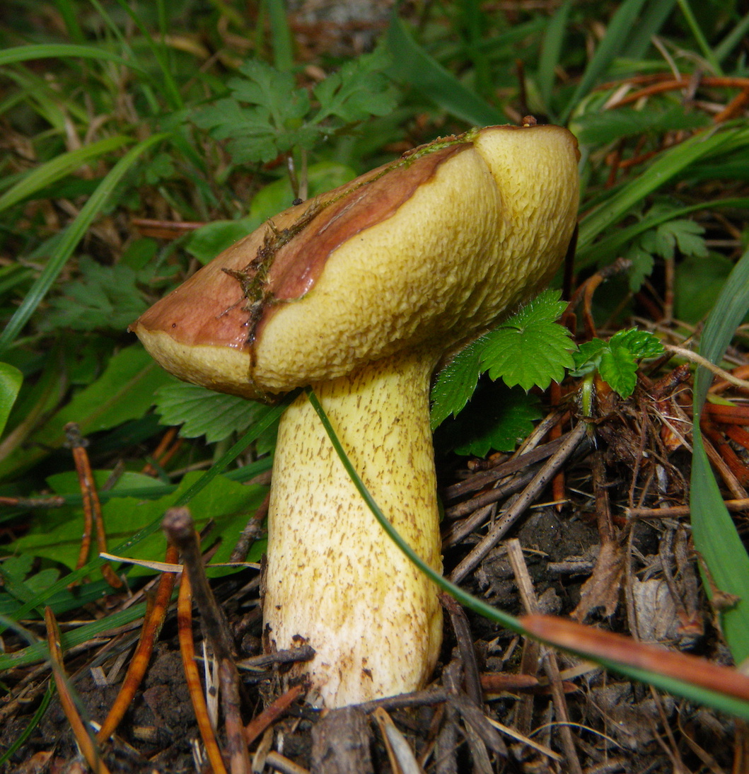 Diesen Pilz aus Laax Schweiz 1200m habe ich zuerst als Suillus granulatus angesprochen, bin mir aber nicht mehr ganz sicher, wegen des braunen Stieles, der schleimige Hut würde passen. Gibt es auch braune Stiele? Manchmal finde ich auch Suillus granulatus mit aufgerollten helleren Hüten, bes. wenn sie trockener sind.