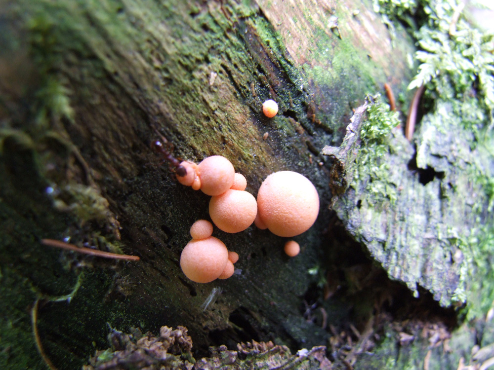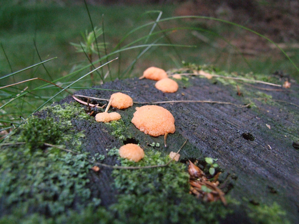 Edit: Also der Blutmilchpilz sieht mir auf Vergleichbildern ganz anders aus. Auch die Gallertträne hat eine andere Oberflächenstruktur. Ich würde die Oberfläche nicht als komplette Kugel, sondern als Einzelelemente beschreiben.