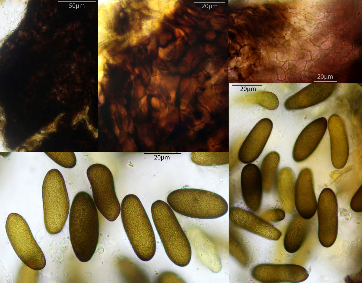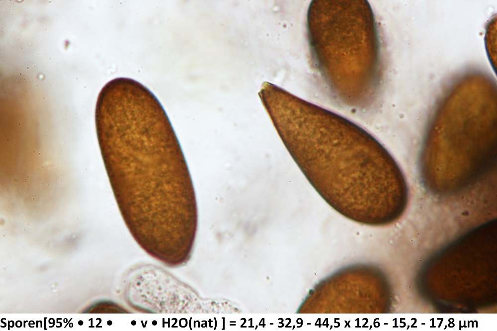 Ich habe die "typischen" reif rotbraunen und bis 2-fach septierten Kondien mit den Maßen 30-39-45 x 13,5-16-19 µm, aber ich kann schwer entscheiden, ob die Wände wirklich glatt sind. Sie erscheinen mit eher fein löchrig, zumal ich manchmal, wenn ich die Wand seitlich scharf stelle, also in der Sporenmitte, was die Schärfeebene angeht, meine, sehr feine, ganodermasporenartige Röhren erkennen zu können. Die Originalbeschreibung ist allerings, was die Morphologie angeht, recht dürftig, finde ich und meine Konidienmaße streuen viel stärker als dort angegeben. Sie sind auch etwas schmäler. Ich würde daher eher bei Diplodia sapinea bleiben, aber als cf. oder s.l.