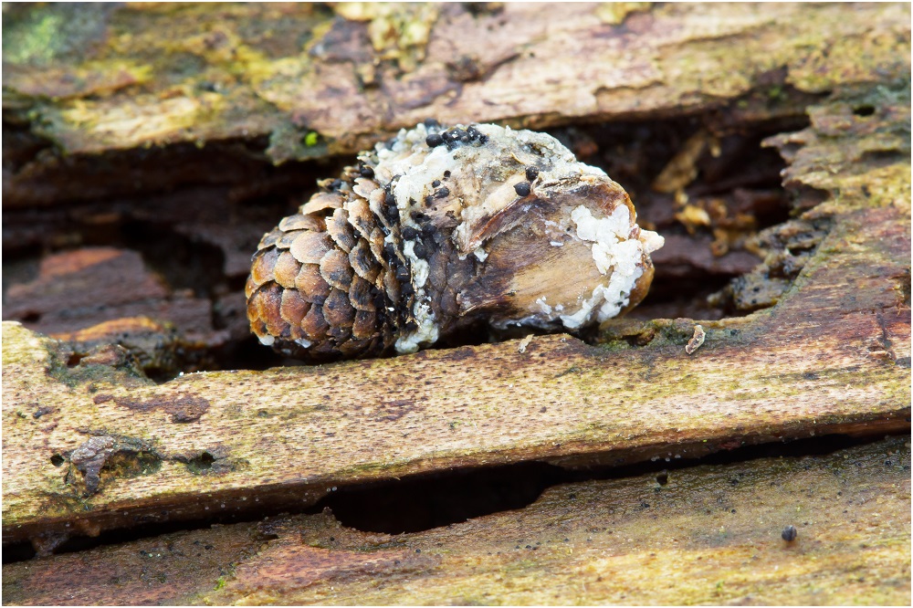 Heute fand ich an einem Kieferzapfen die häufige Sphaeropsis sapinea mit den großen braunen Konidien.