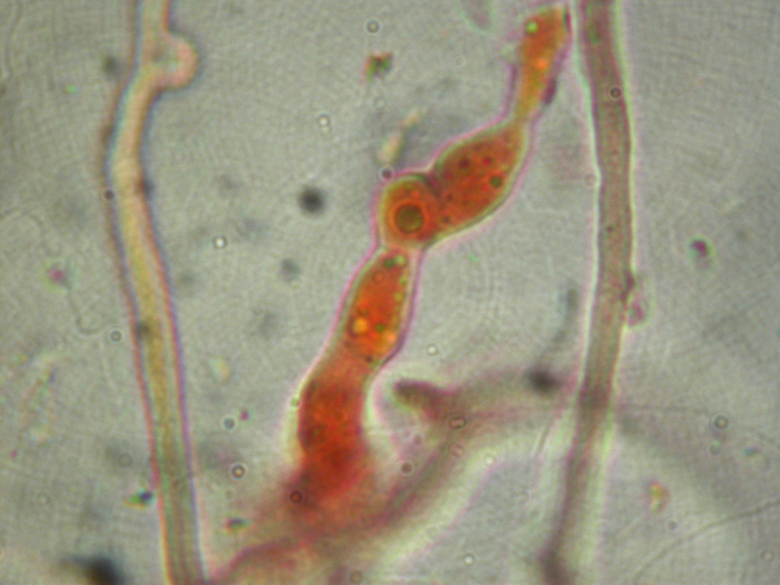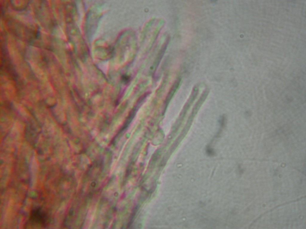 Daheim schaute ich ihn unter der Stereolupe an und mikroskopierte, soweit es mir möglich war. Viele Strukturen kann ich nicht zuordnen und daher wäre ich für eine Einordnung dankbar. Bei den Bildern bei denen ich meine, eine Struktur zu erkennen schreibe ich dies dazu. Leider sind einige Bilder unscharf, was entweder am Mikroskop oder der Kamera oder an meinen Einstellungen liegt. Die Bilder, die als Anhang dabei sind, aus welchen Gründen auch immer, zeigen den Pilz in vierzigfacher Vergrößerung unter der Stereolupe und einen dicken Querschnitt durch den Pilz. Der Pilz hat m.E. auffallend viele Schnallen.