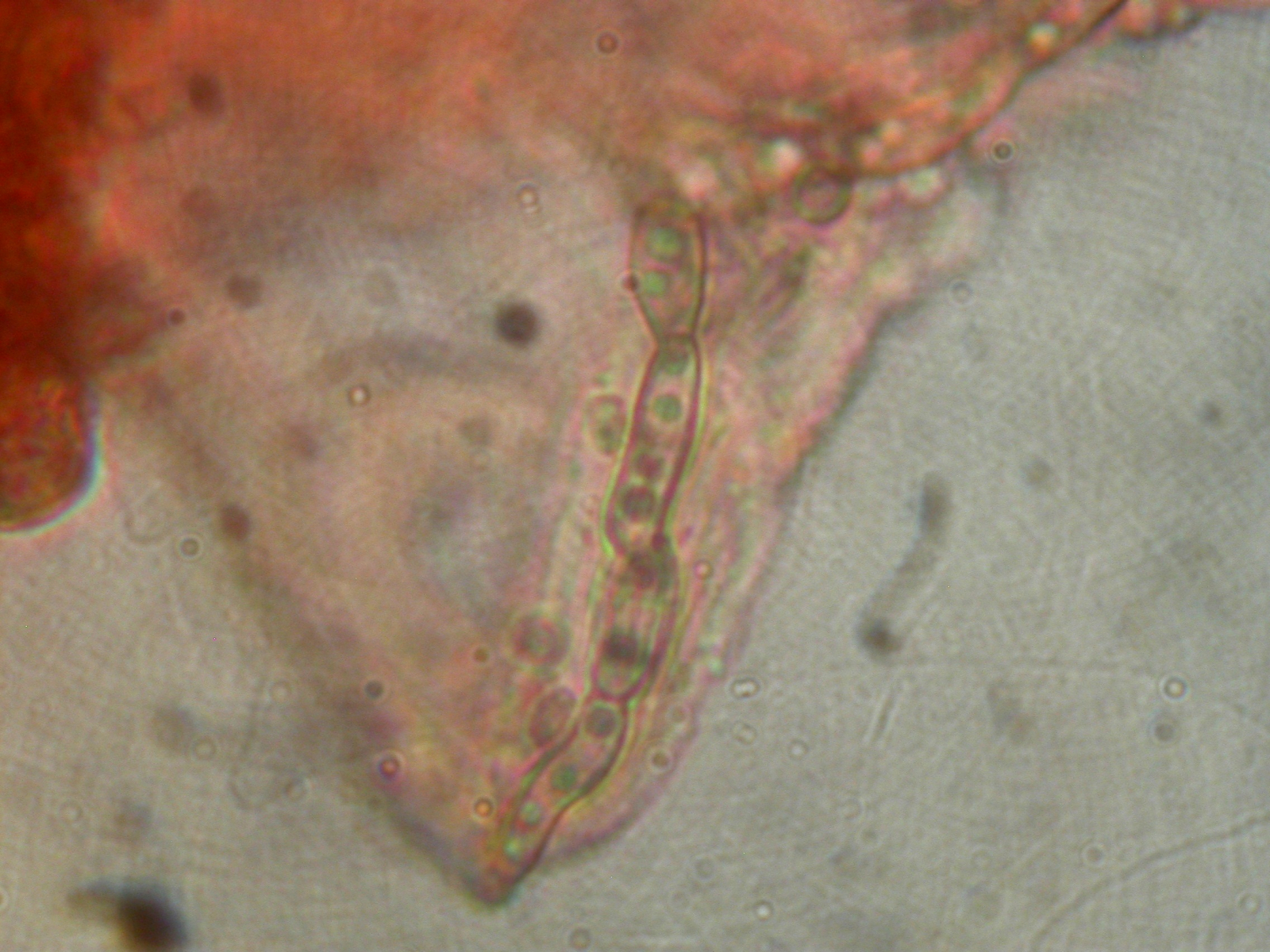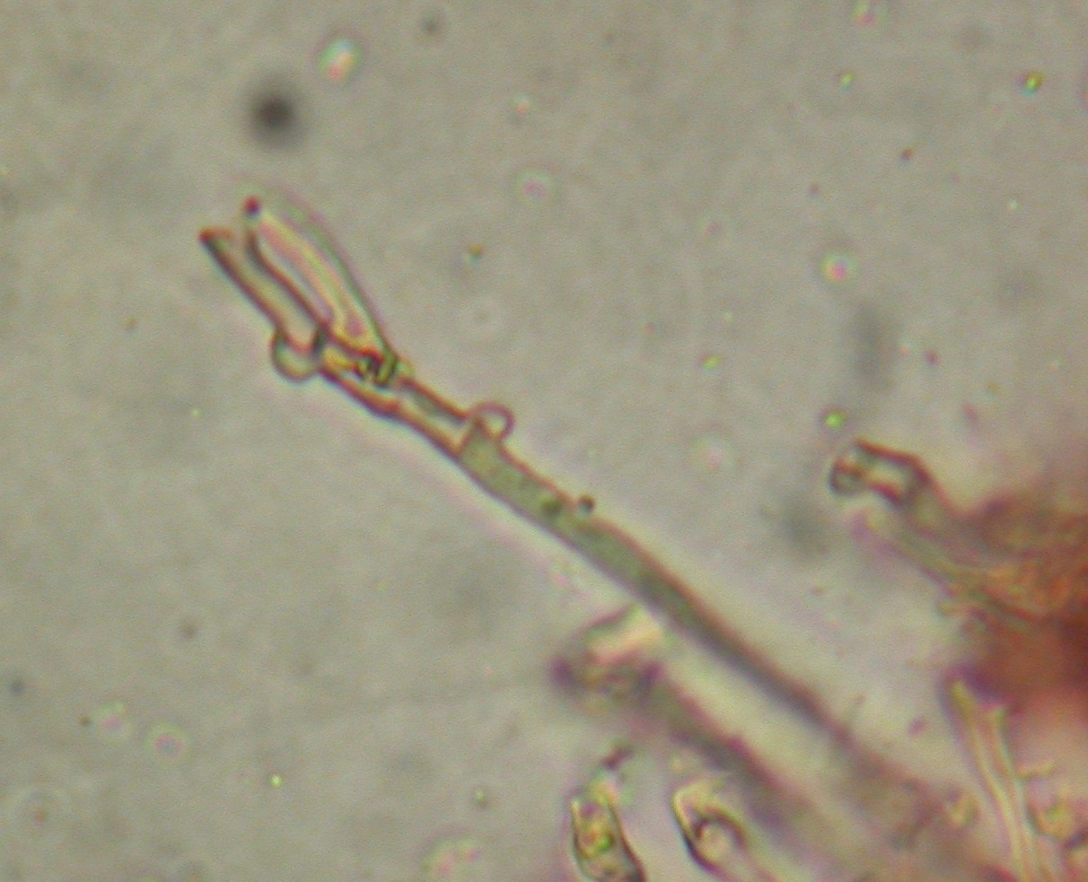 Daheim schaute ich ihn unter der Stereolupe an und mikroskopierte, soweit es mir möglich war. Viele Strukturen kann ich nicht zuordnen und daher wäre ich für eine Einordnung dankbar. Bei den Bildern bei denen ich meine, eine Struktur zu erkennen schreibe ich dies dazu. Leider sind einige Bilder unscharf, was entweder am Mikroskop oder der Kamera oder an meinen Einstellungen liegt. Die Bilder, die als Anhang dabei sind, aus welchen Gründen auch immer, zeigen den Pilz in vierzigfacher Vergrößerung unter der Stereolupe und einen dicken Querschnitt durch den Pilz. Der Pilz hat m.E. auffallend viele Schnallen.