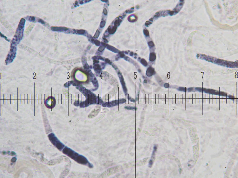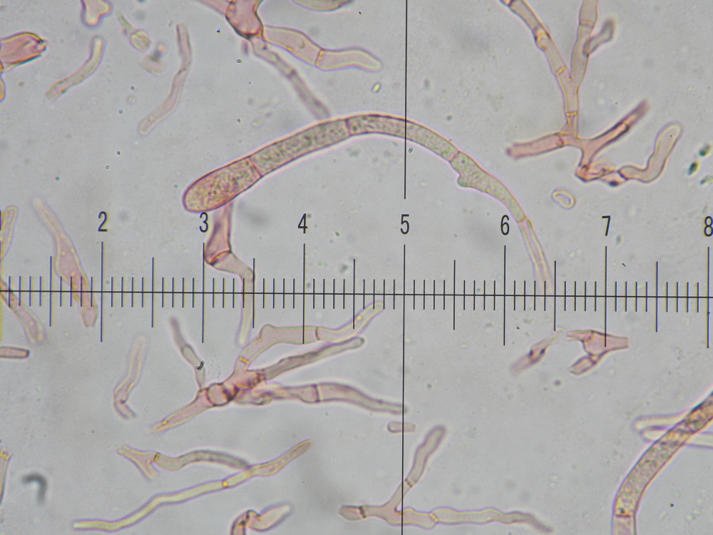 HDS sonst: Haare vielseitig, zylindrisch, spindelig, gabelig, Divertikel, septiert, 3,5 - 5 µm breit