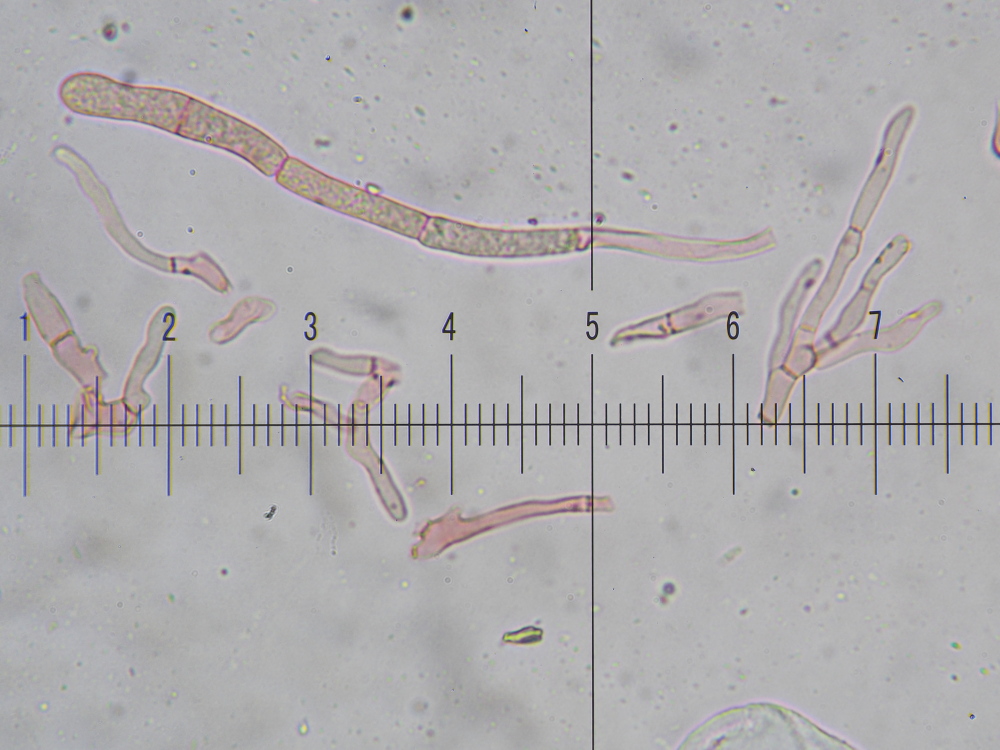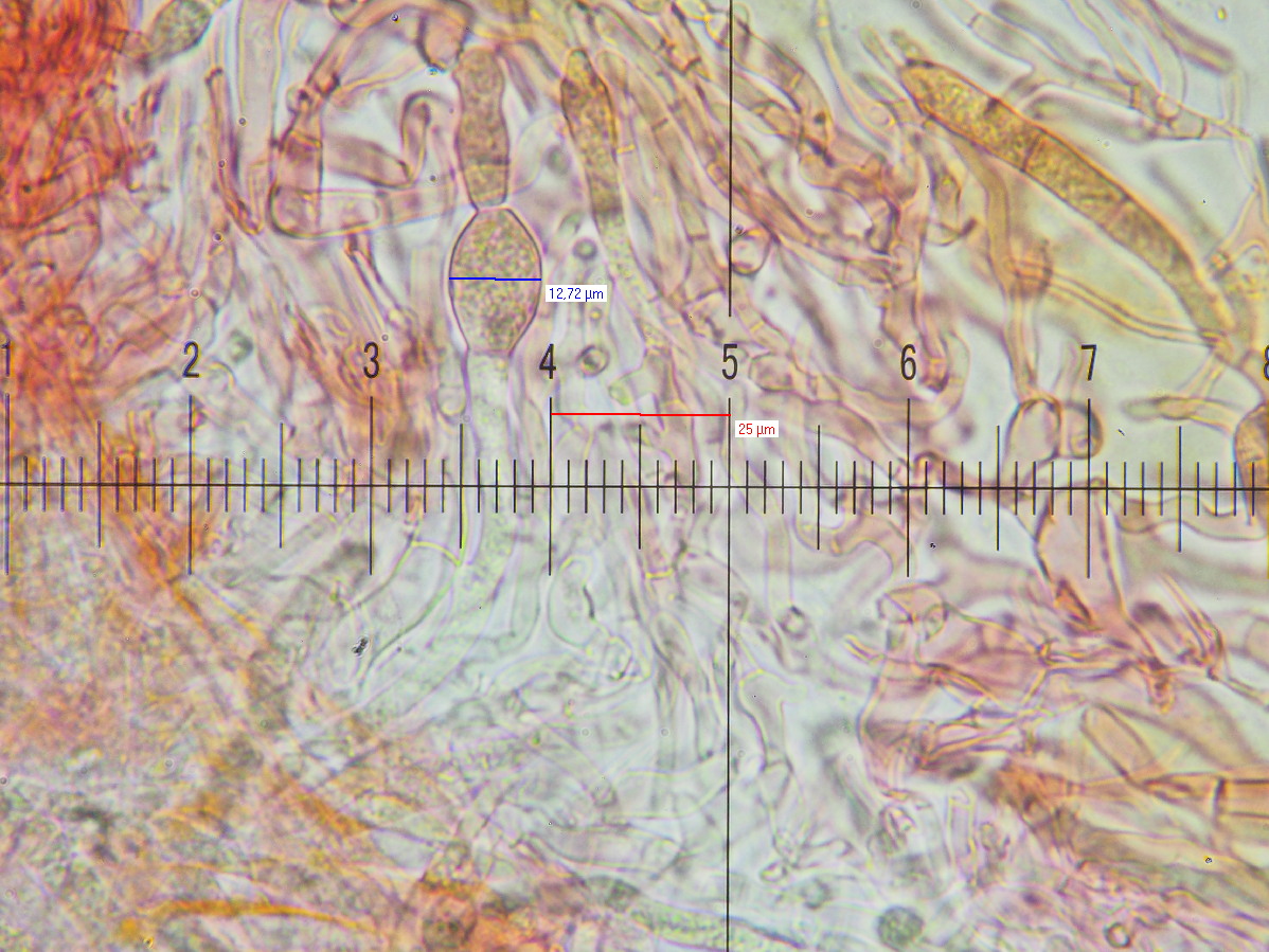 HDS Pileozystiden: vorhanden, zylindrisch, keulig, leicht kopfig, blasig, Divertikel, septiert, 8,5 (13) µm breit