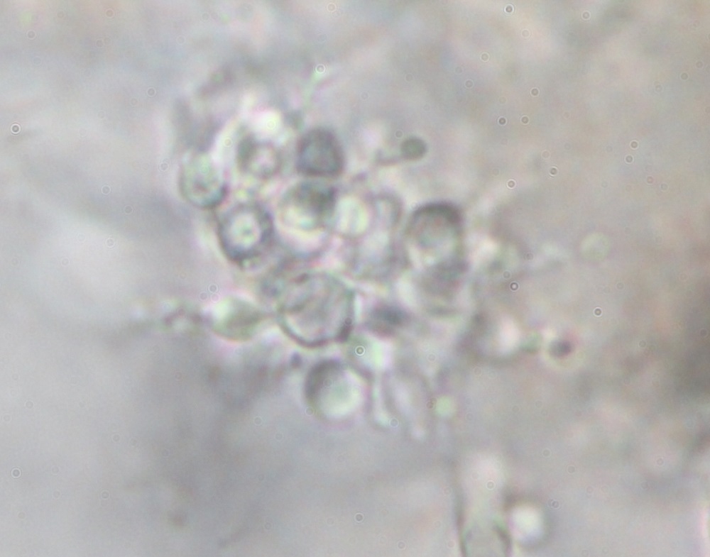 4. Auf diesen Zellen wachsen weitere runde Zellen. Dies könnten konidiogene Zellen (Zellen die Konidienbilden können) sein.