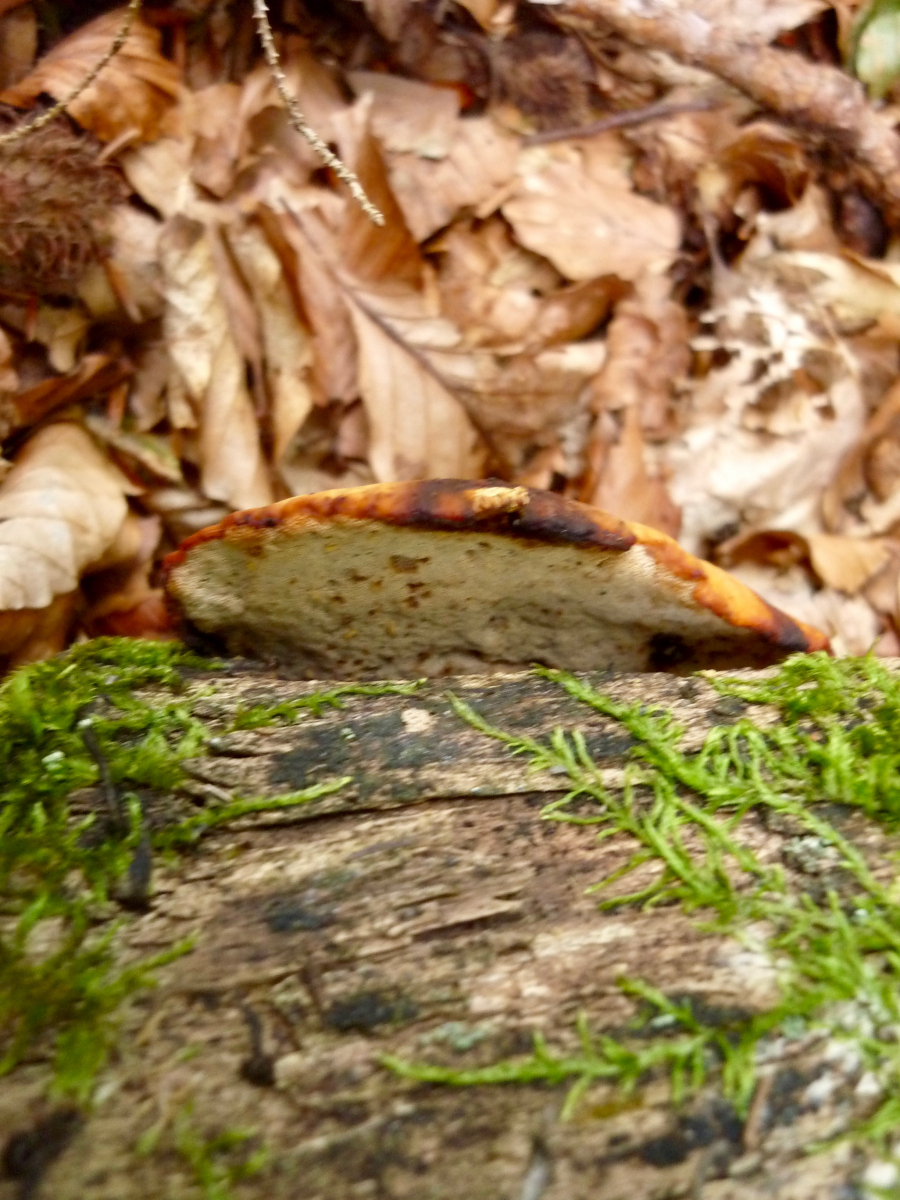 Den Angebrannten Rauchporling hatte ich immer mit mehr Struktur und einzelnen Pilzhüten im Kopf. Aber jetzt, wo Du es sagst, sehe ich auch, dass das Foto viel Ähnlichkeit mit den Poren und der Struktur dieses Pilzes hat.
