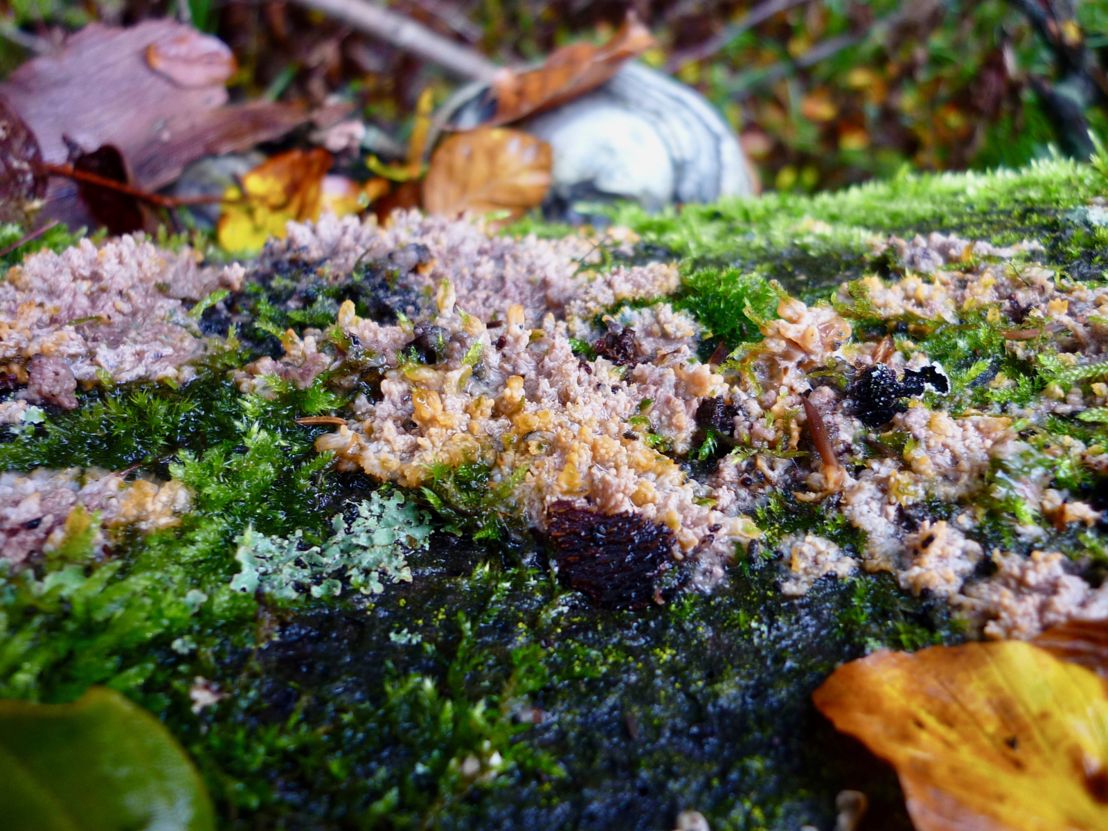 7: Chondrostereum purpureum? Irgendwas violettes, schichtiges, das durch das Moos seltsam gewachsen ist?!