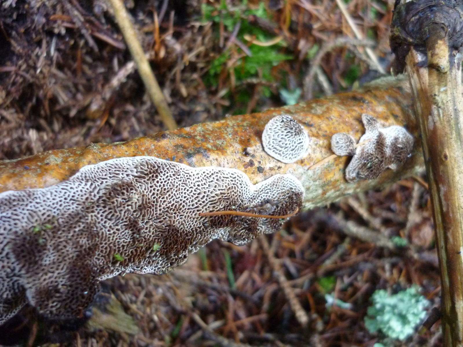 12 ist wieder eine schlechte Aufnahme. Es zeigt die Unterseite eines morschen Astes, den ich umgedreht habe und es handelt sich nicht um entstehende Fruchtkörper sondern um eine Unmenge kleiner Poren. Also es ist ein resupinater Pilz ohne Hut und Struktur, weißt Du, was ich meine? So etwas wie die Datronia nur mit viel kleineren Poren.