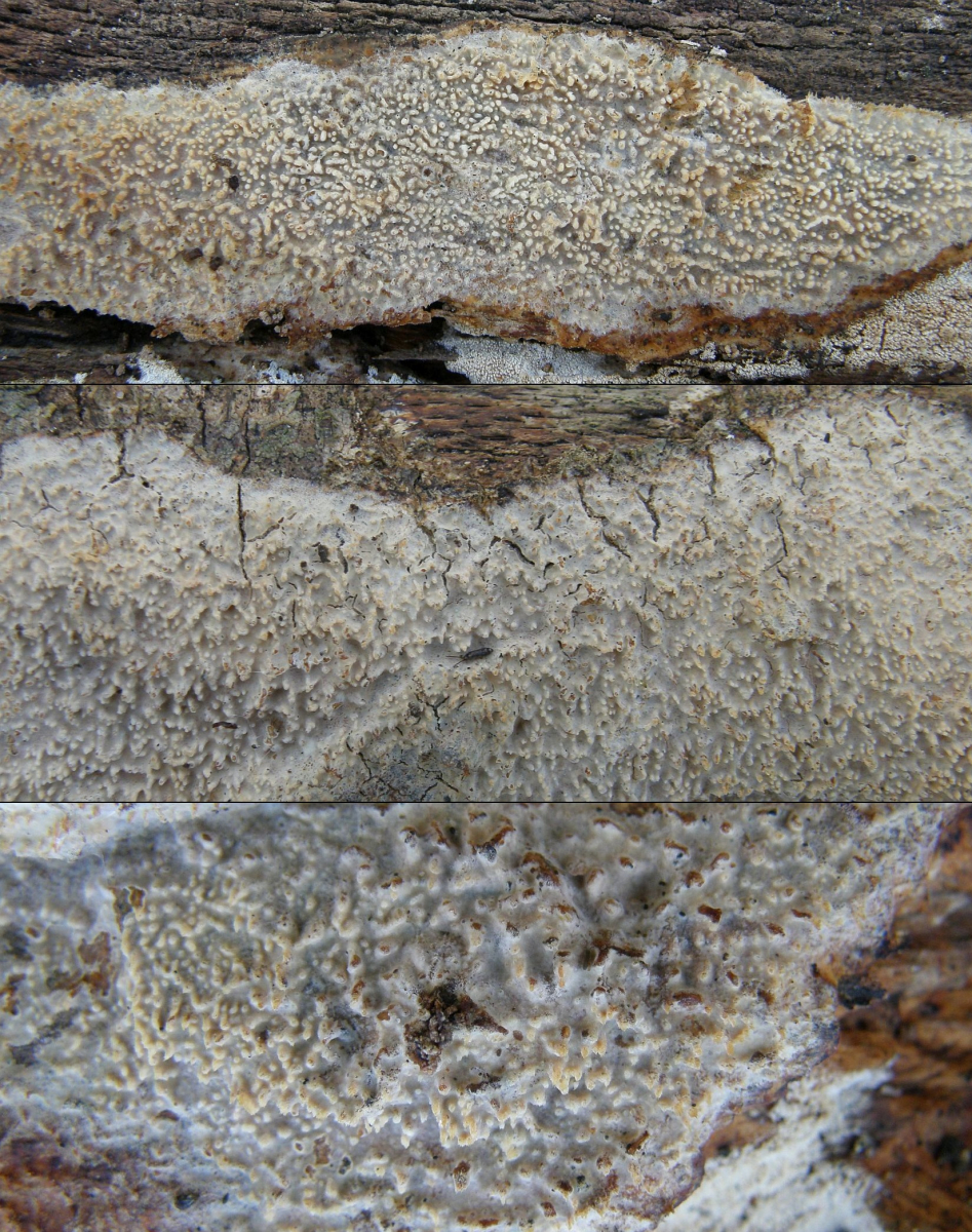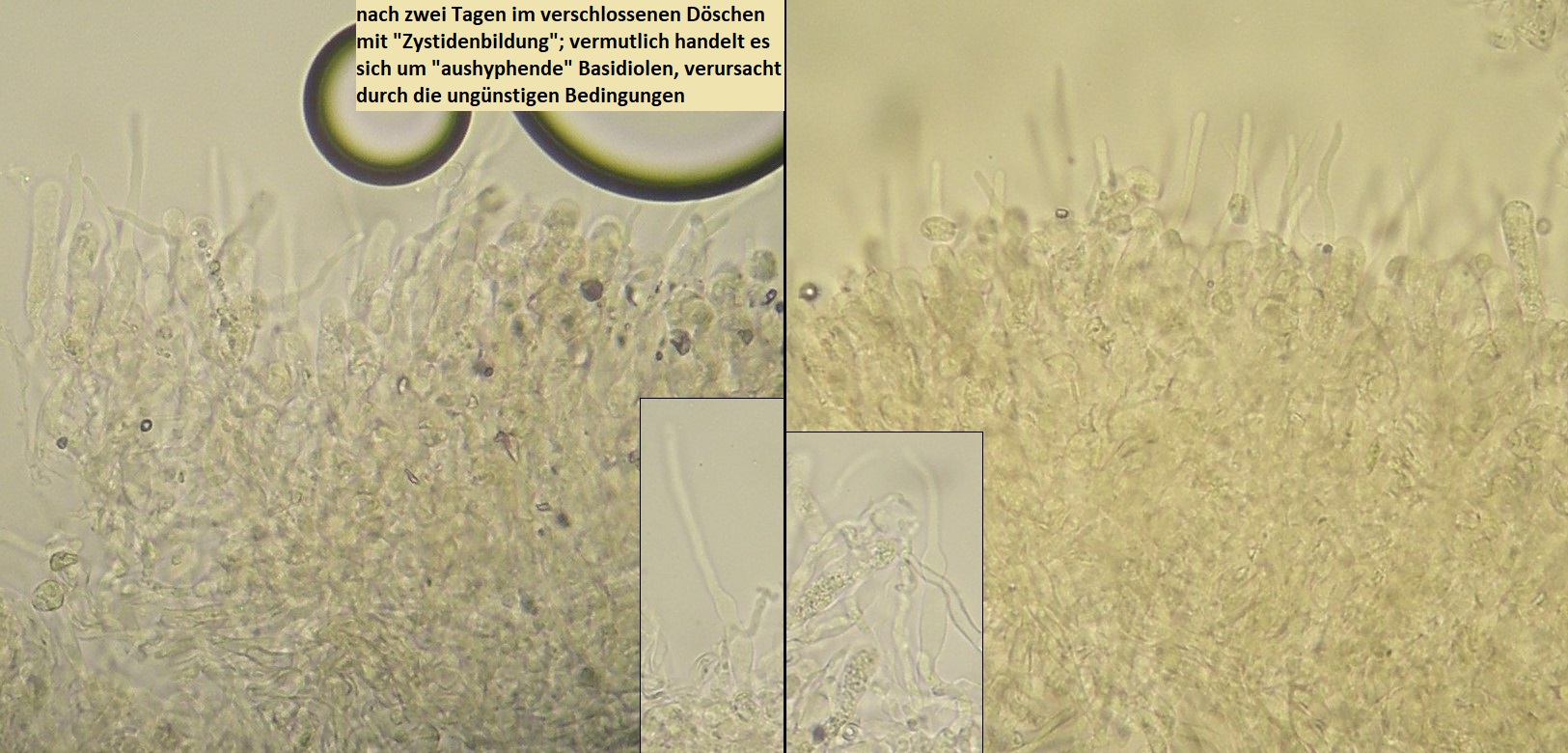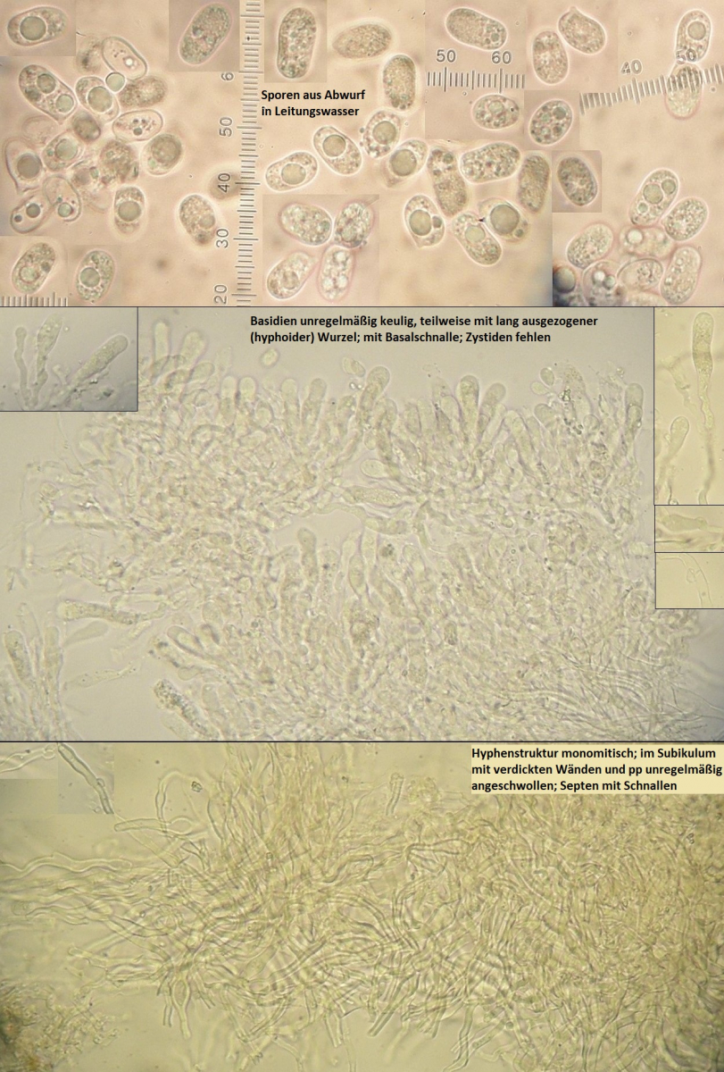 Und beim Liegenlassen im geschlossenen Döschen passierte das, was auch manchen anderen Pilzen (Lamellenpilzchen, zB verschiedene Tricholomataceae) gelegentlich passiert: Es wurde eine neue Art draus. In diesem Fall ein Radulomyces mit Zystiden, also Radulomyces pseudocystidiatus spec. nov.: