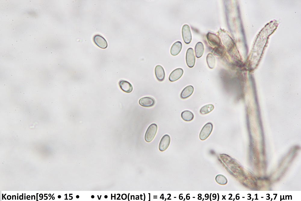 Das Konidiophor ist im unteren Bereich braun und wird im oberen Bereich hyalin.