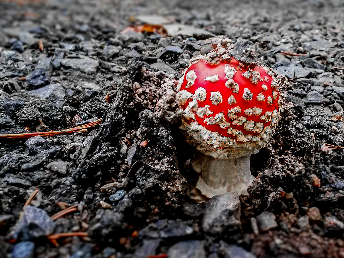 Mein eigenes Bild war eine emotionale Katastrophe: Ich entdeckte diesen Pilz (letzten Herbst in Schweden) zum total falschen Zeitpunkt: Ohne Kamera, ohne Zeit und fast ohne Licht. Oh nein!!! Mir blieb nur ein Erinnerungsfoto mit meiner billigen Handykamera. Dunkel, verpixelt und total unscharf. Der Zustand der Velumreste (kein Verpixeln, sondern Rauschen und Bewegungsunschärfe) war der des ganzen Bildes! Als nun das passende Motto kam habe ich mich an das Bild erinnert und gerettet was eben noch ging und das Foto "aufgehübscht". Einen Treppchenplatz hat es eigentlich nicht verdient! Und ja, es war tatsächlich Asphalt, durch den der Kleine sich durchgedrückt hatte.
