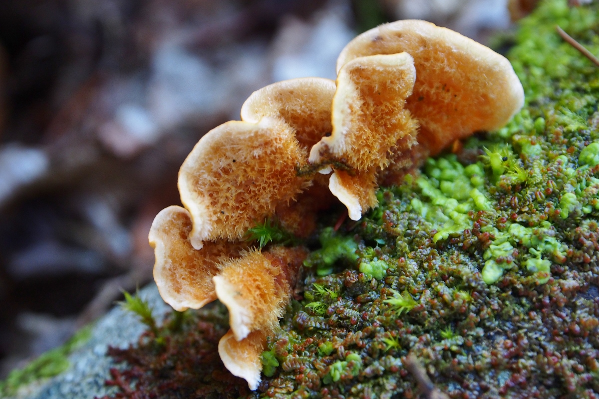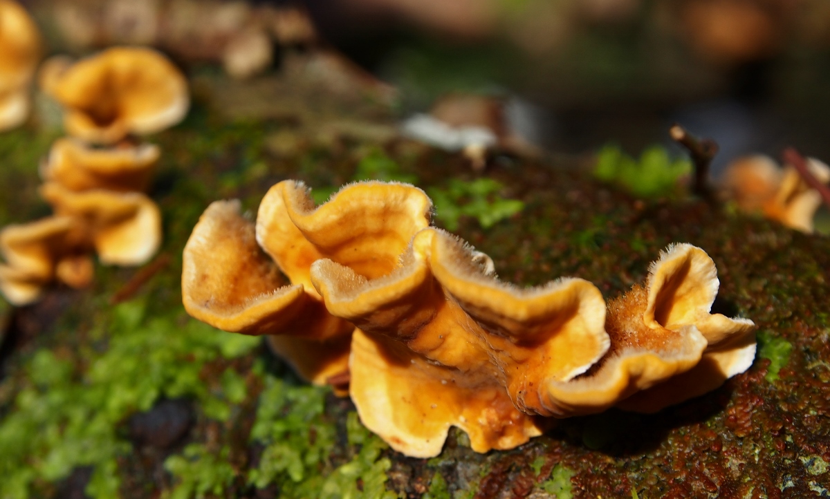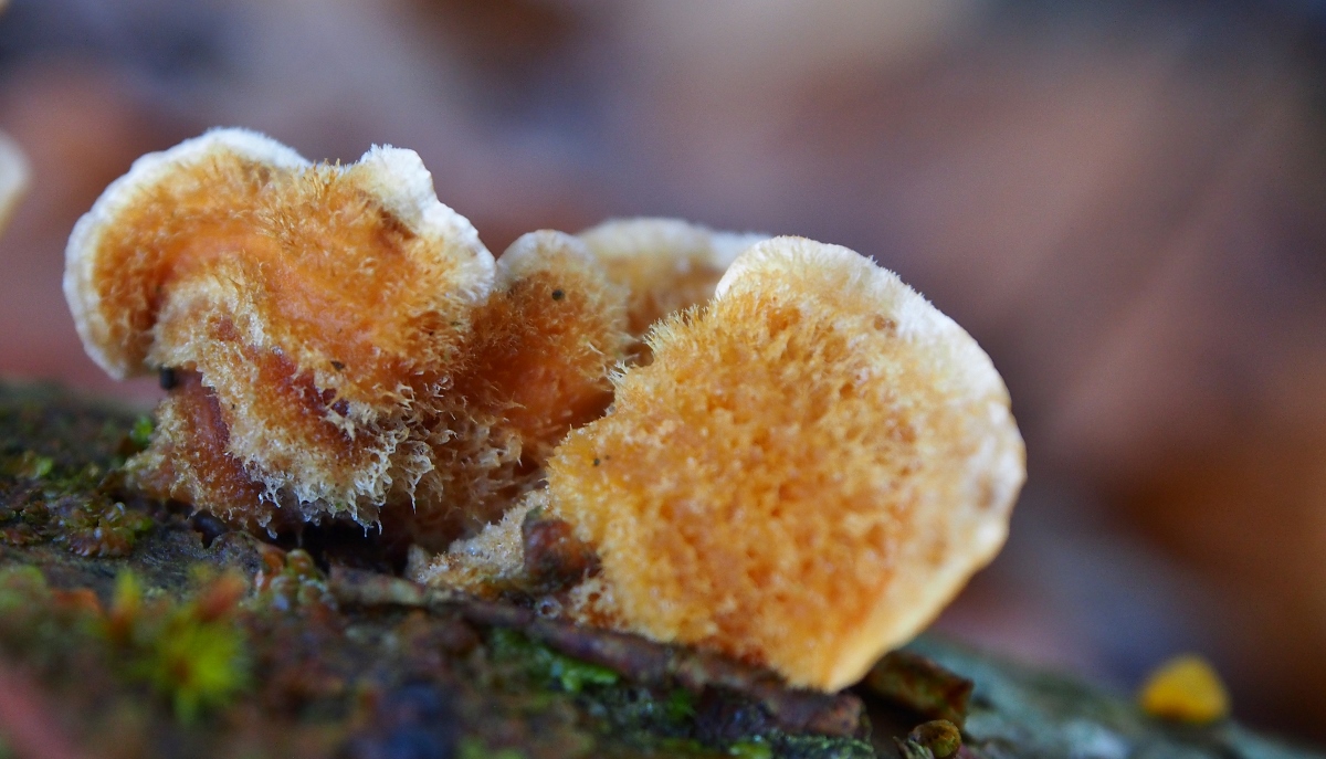7. Hier ein sonniger Farbtupfer: Striegeliger Schichtpilz (Stereum hirsutum)