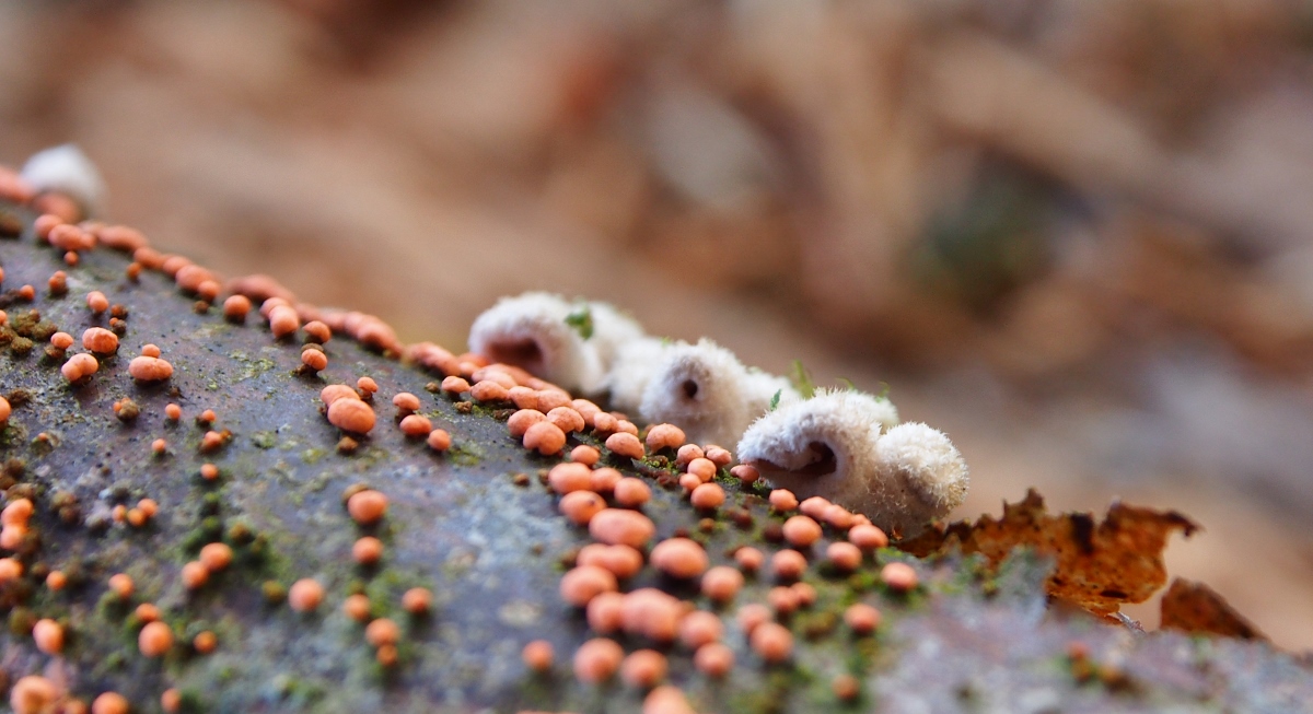 Hier mit dem Zinnoberroten Pustelpilz (Nectria cinnabarina)