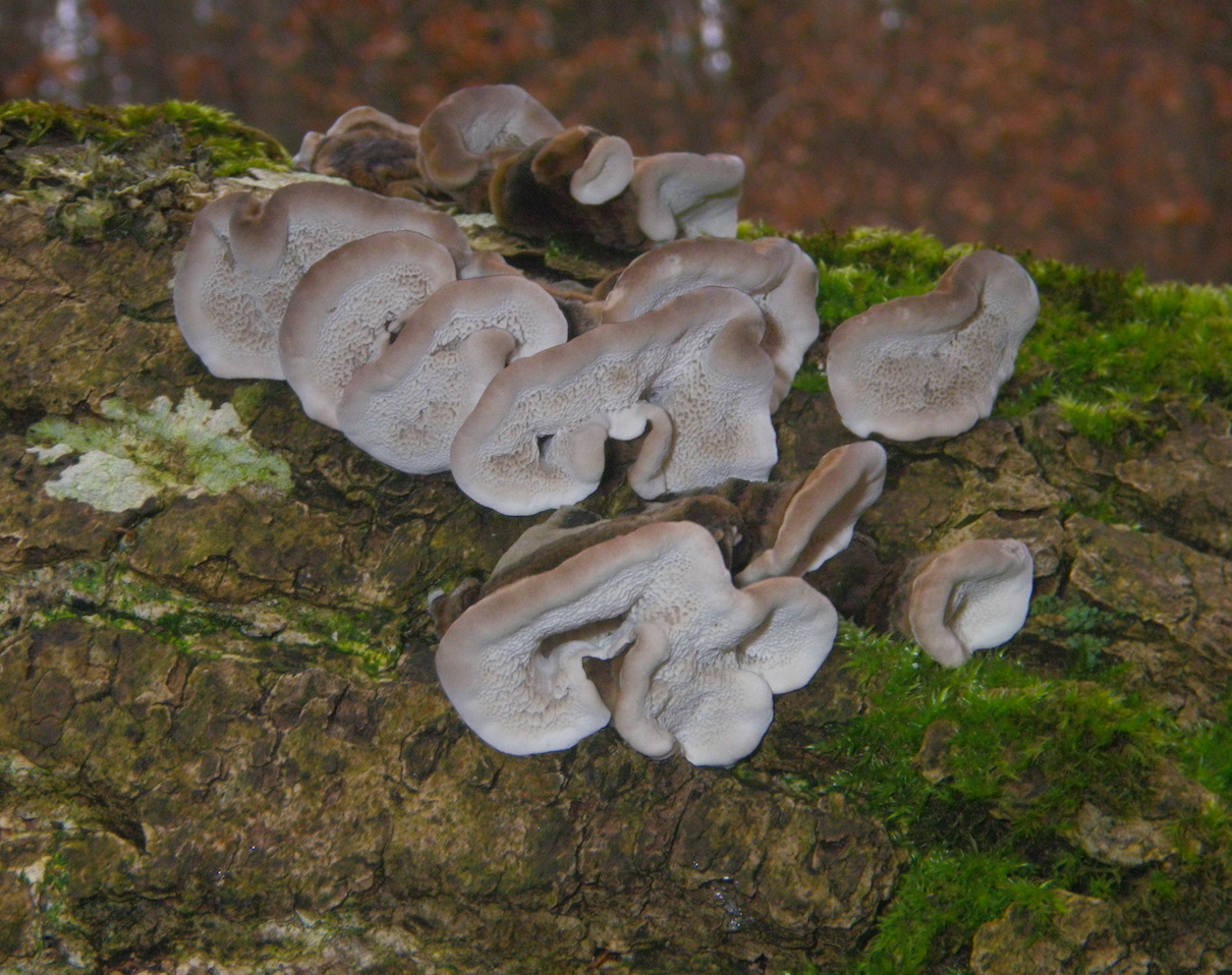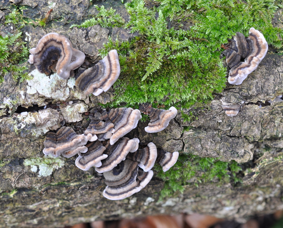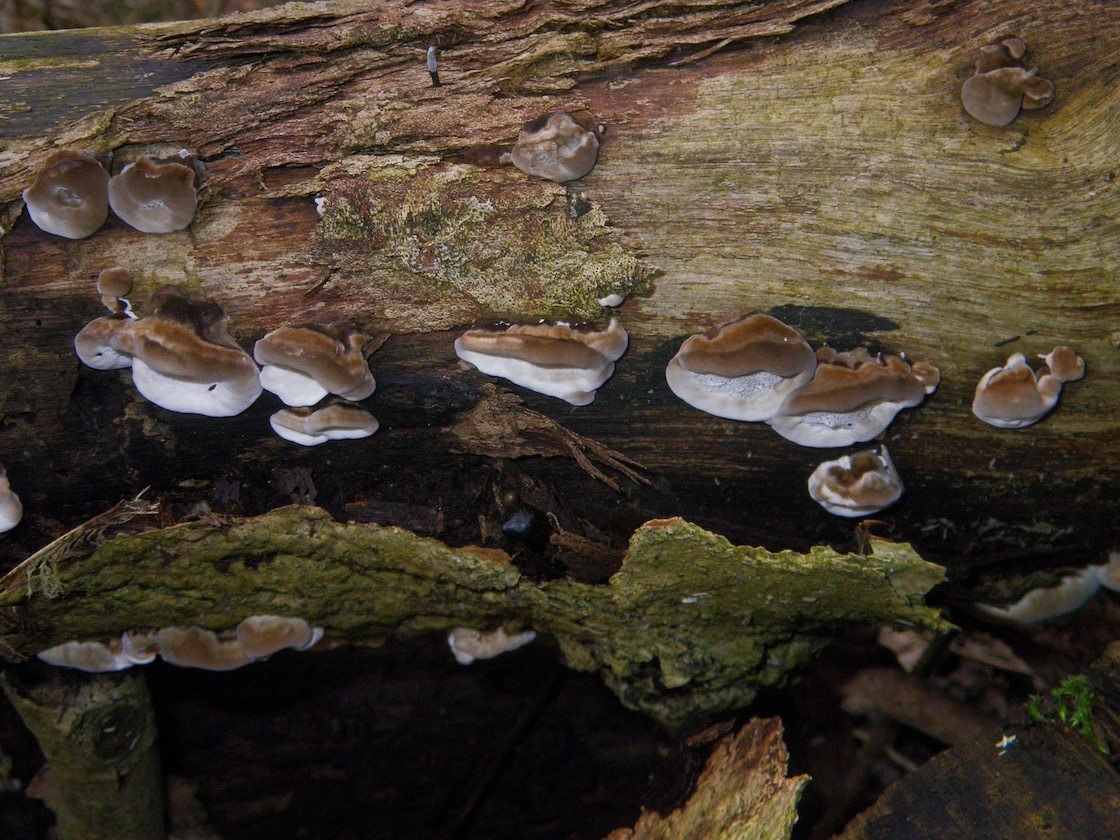 Sind das alles junge Trameten Trametes versicolor, sie waren noch relativ klein und hatten alle einen relativ ausgeprägten weichen Randwulst. Was mich etwas irritiert sind die gut ausgebildeten kräftigen Poren, bei den alten Trametes versicolor habe ich dies nicht so gesehen! Könnten es auch junge Rauchporlinge sein?