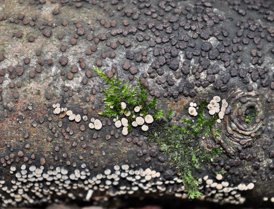 Habe heute in unserem Wald an einem Ast neben "Zusammengedrängten Kohlenbeeren" Hypoxylon cohaerens auch noch weisse sehr kleine Pilze entdeckt. Habe nichts dazu gefunden, sie waren nur 2-4mm gross, oval, grenzten sich deutlich von den Zusammengedrängten Kohlenbeeren ab. Um welche Pilze handelt es sich?