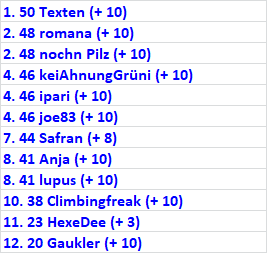 Ich werde nachher auflösen und einen neuen Rätselpilz bringen. Die Nr.10