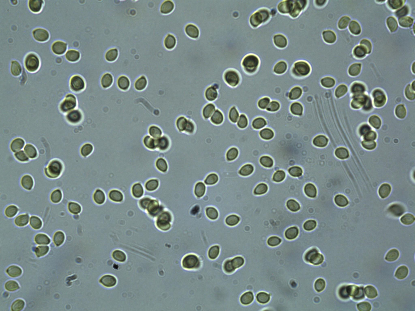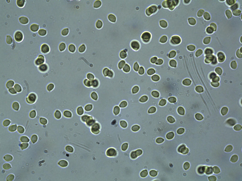 SPP war auf dem Objektträger weiß - in der Büchse, in dem der Pilz länger lag, erschiehn es eher grau. Es wuchsen 2-3 Exemplare fast büschelig zusammen.