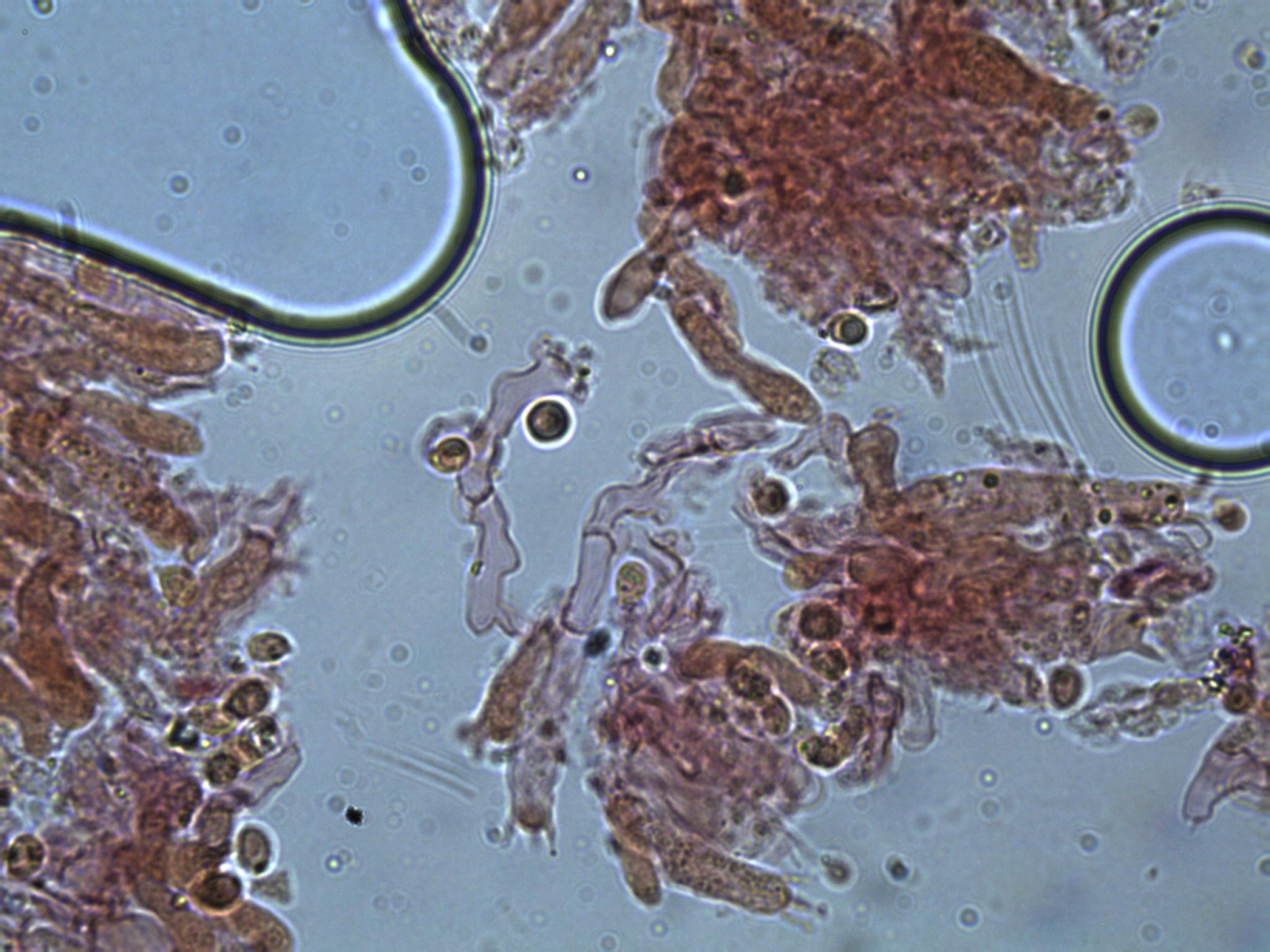 Sporen: J-; 4,5 x 3,3 µm (4,0 - 5,6 x 2,7 - 4,0); Q = 1,4; Basidien: 4 sporig, schlank