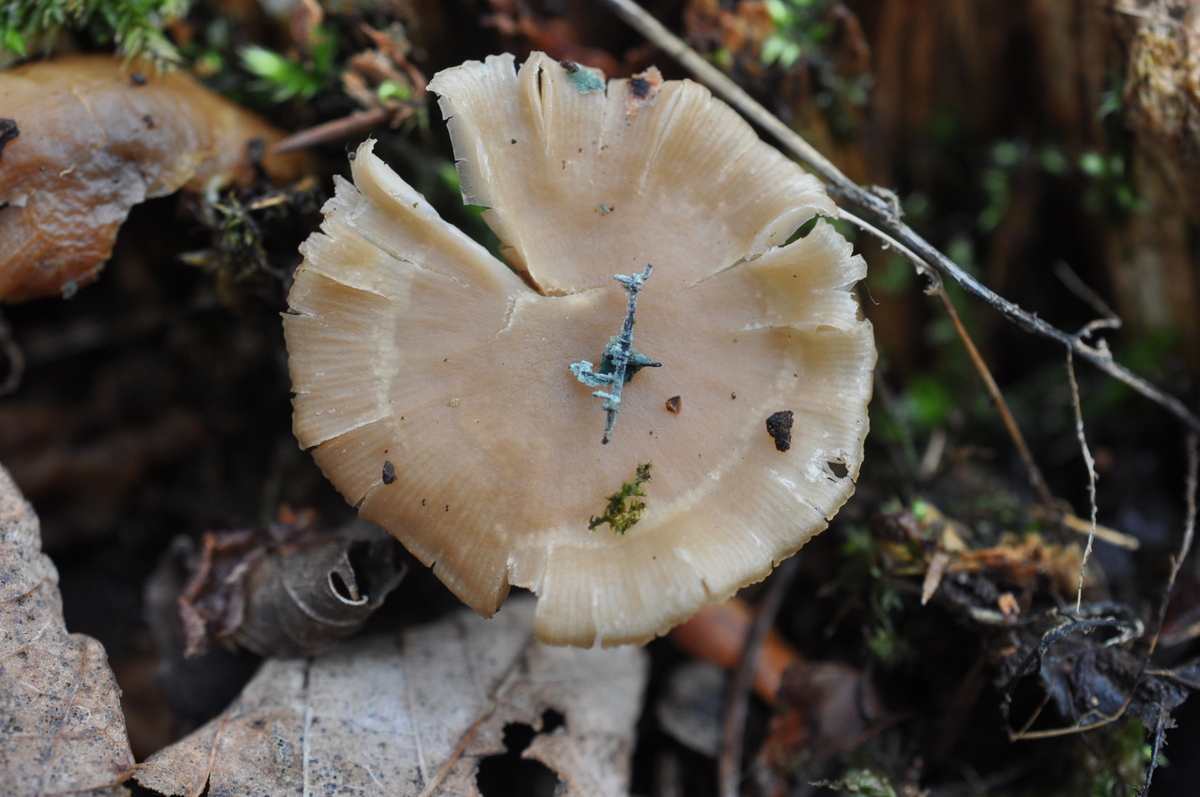Hut : Bis 5cm Durchmesser , jung weißlich mit violetter töne später grauviolett bis grauocker , Rand lange eingerollt in älter aufgebogen , oft gereift , Oberfläche matt .