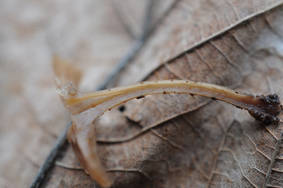Stiel : Graubraun bis Hellbraun mit violett töne , faserig , im älter hohl , Basis mit Myzelfaden .