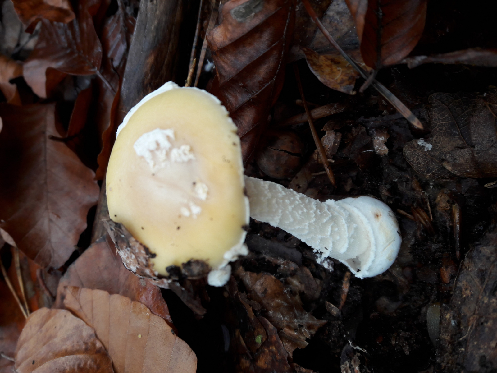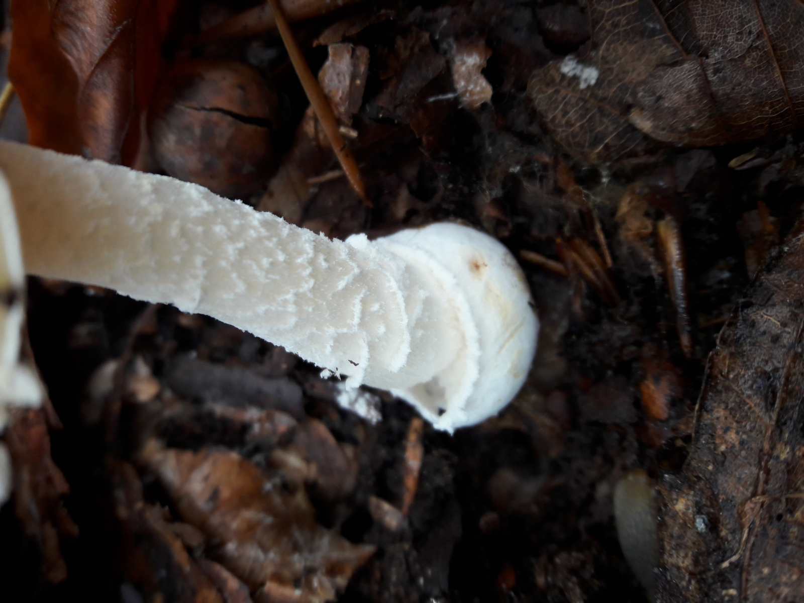 Schöne Aufnahmen der Stielbasis vom Narzissengelben Wulstling, wo man auch die Ähnlichkeit zum Pantherpilz gut erkennt.