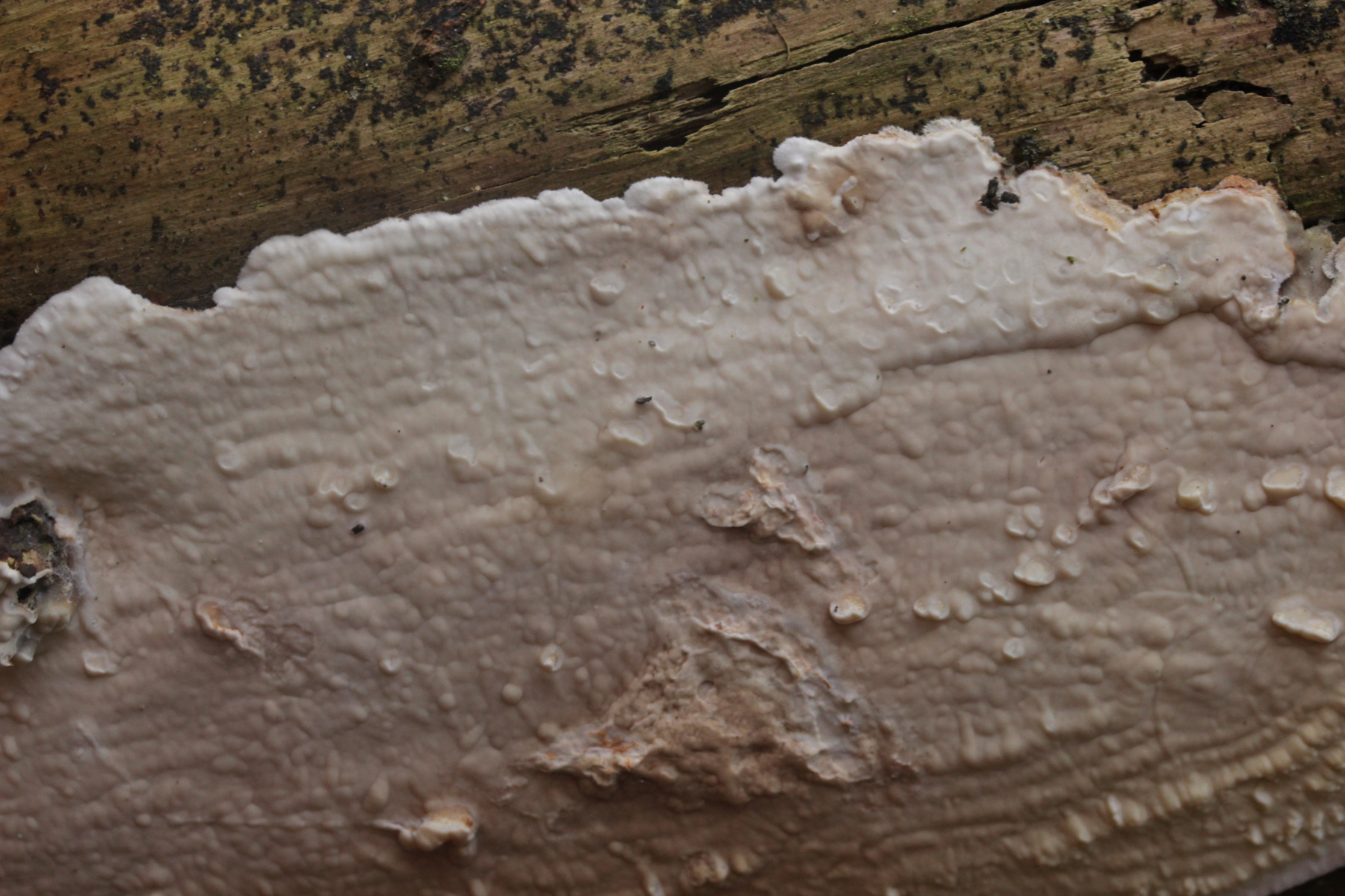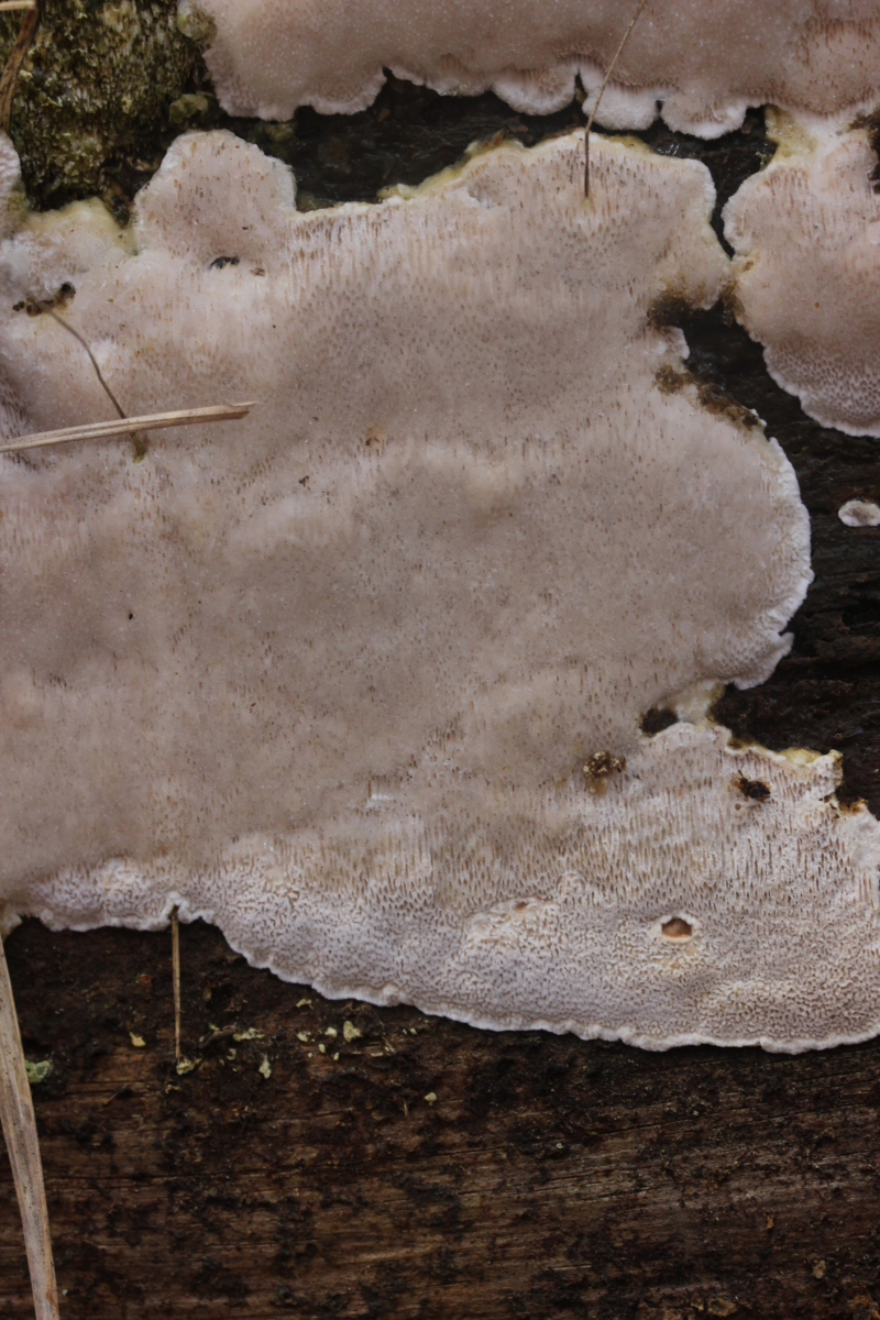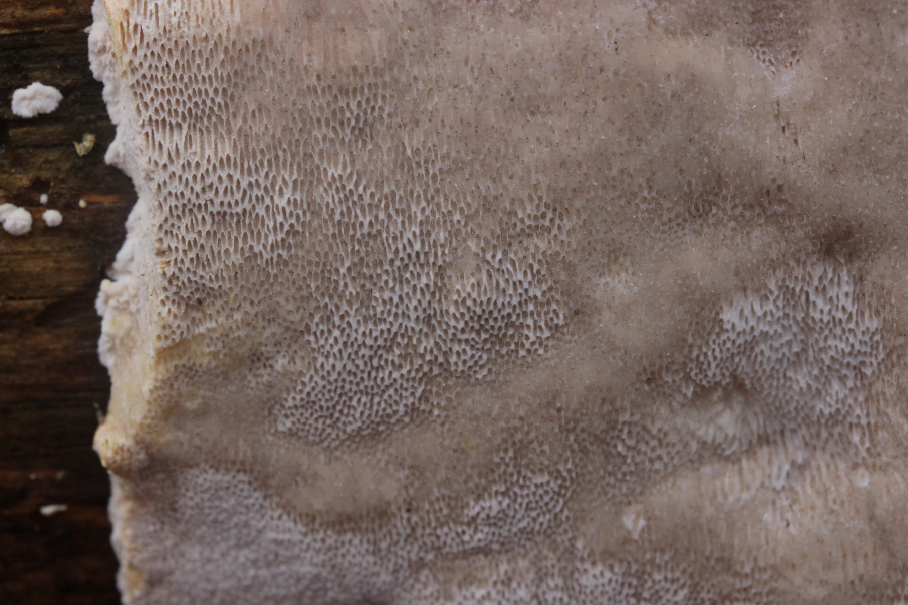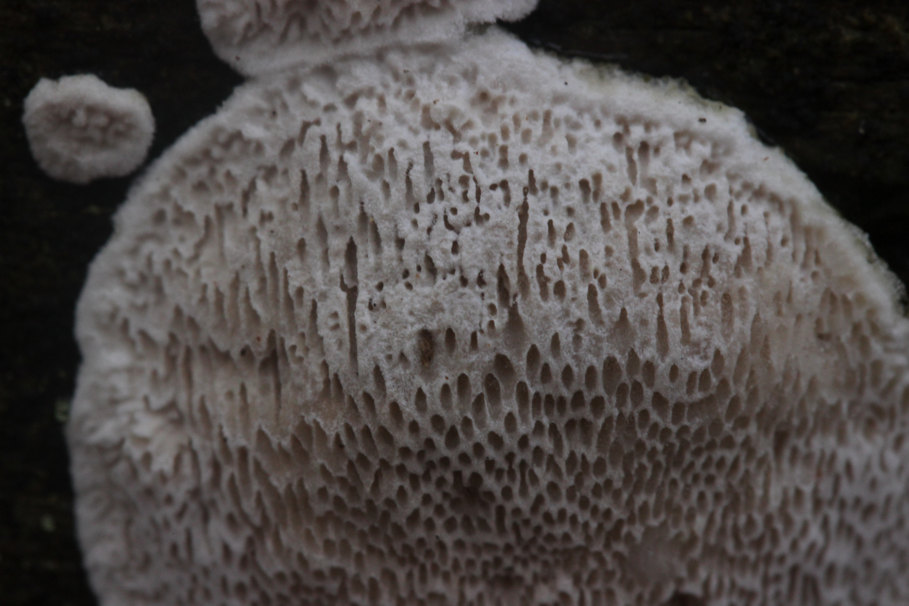 Wenn's ein anderer Fundort wäre, die Poren größer als bei Marios Fund (das könnte hier auf den Bildern aber täuschen, so daß sie größer aussehen als sie waren), und der Pilz außergewöhnlich weich und innen ganz glasig war: Das hier hat schon eine gewisse Ähnlichkeit mit angetrockneten Fruchtkörpern von >Parmastomyces mollissimus<. Ist es aber natürlich nicht, wenn nicht so weich und an Marios bekanntem Stamm gefunden.