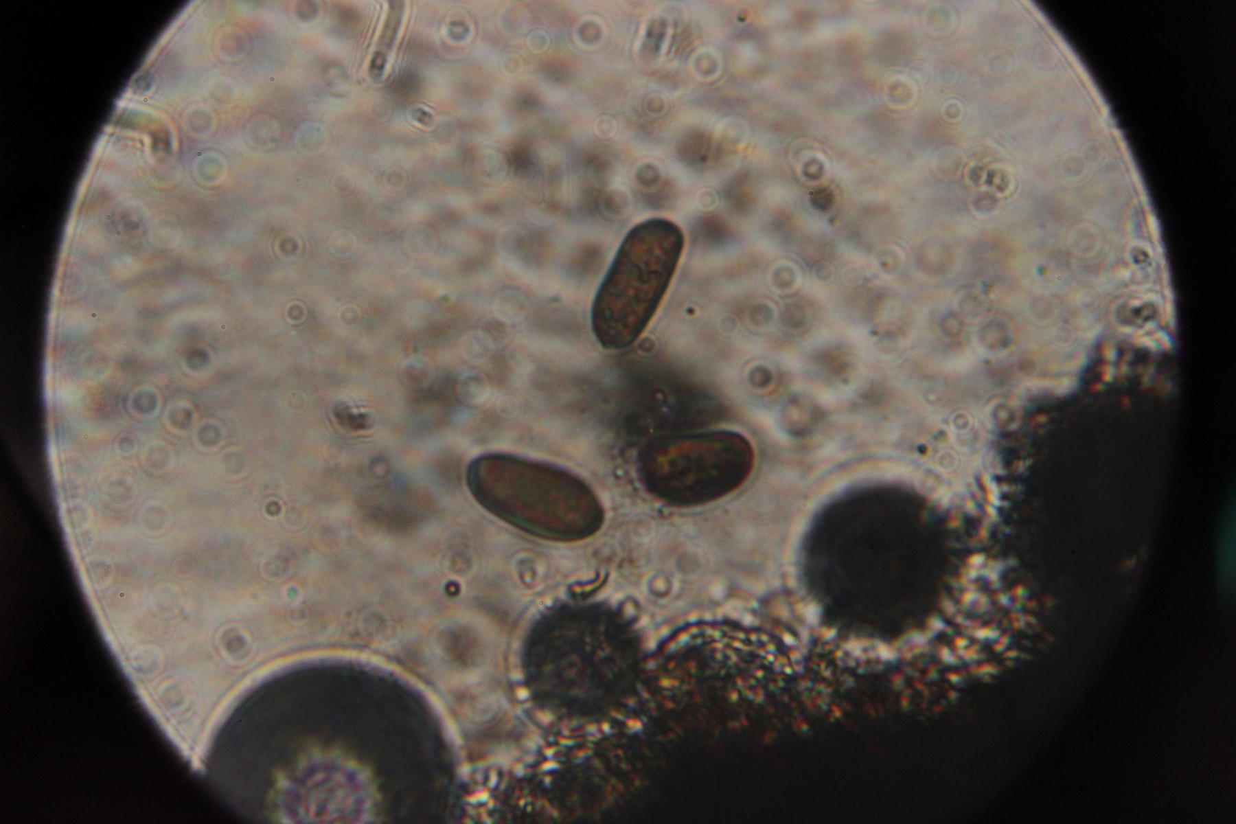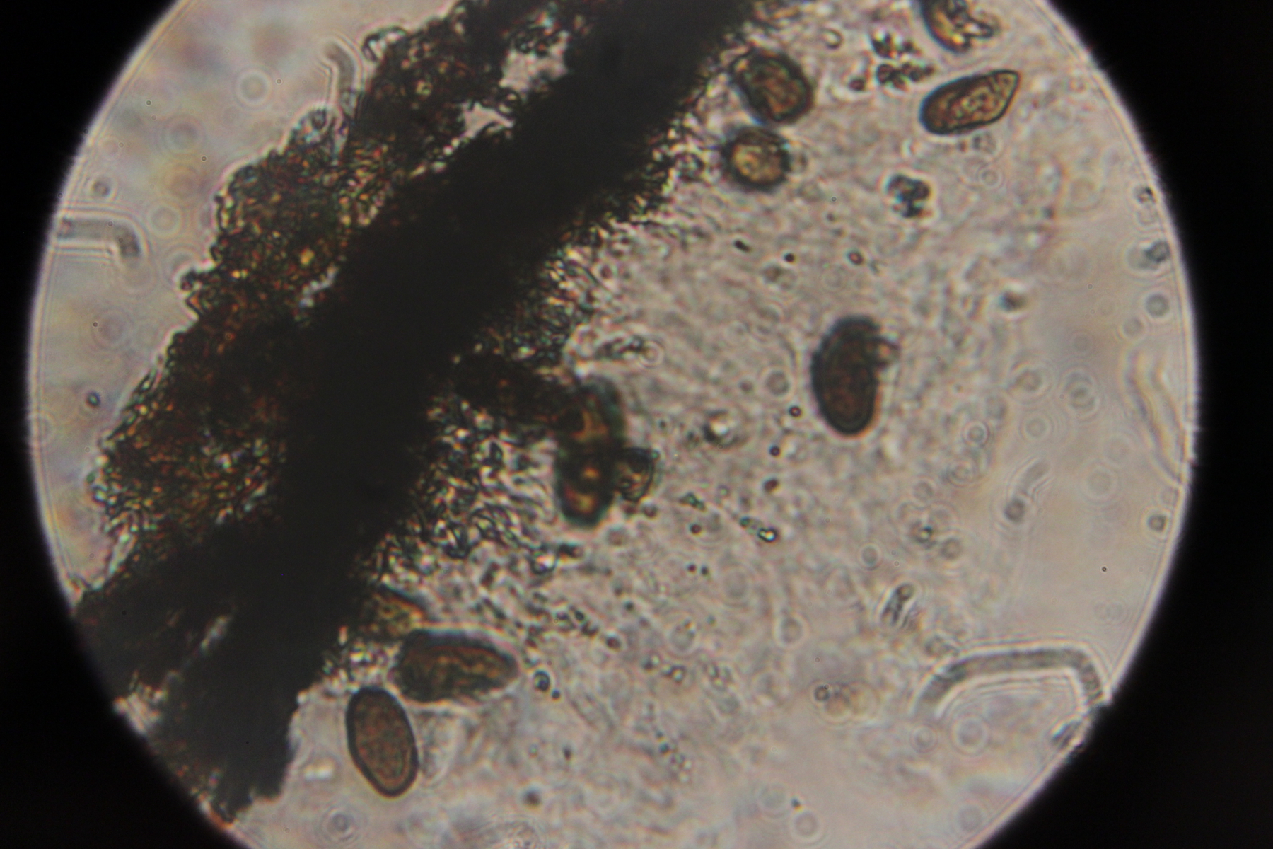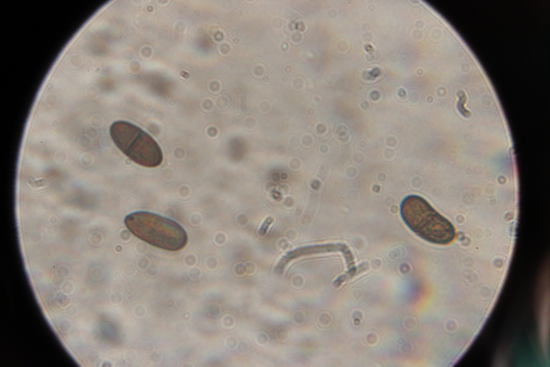 ist doch ein tolles Bild. Und man kann zumindest die makroskopische Größe besser einschätzen. Für Leute, die die Art also kennen sollten oder sich schon häufiger mit dem Substrat beschäftigt haben, ist das sicher hilfreich. Eine Sache noch: Deine Sporen sehen zum Teil septiert aus (Bild 4). Das würde auch eher nicht passen. Aber joa, wir können's auch dabei belassen. :)