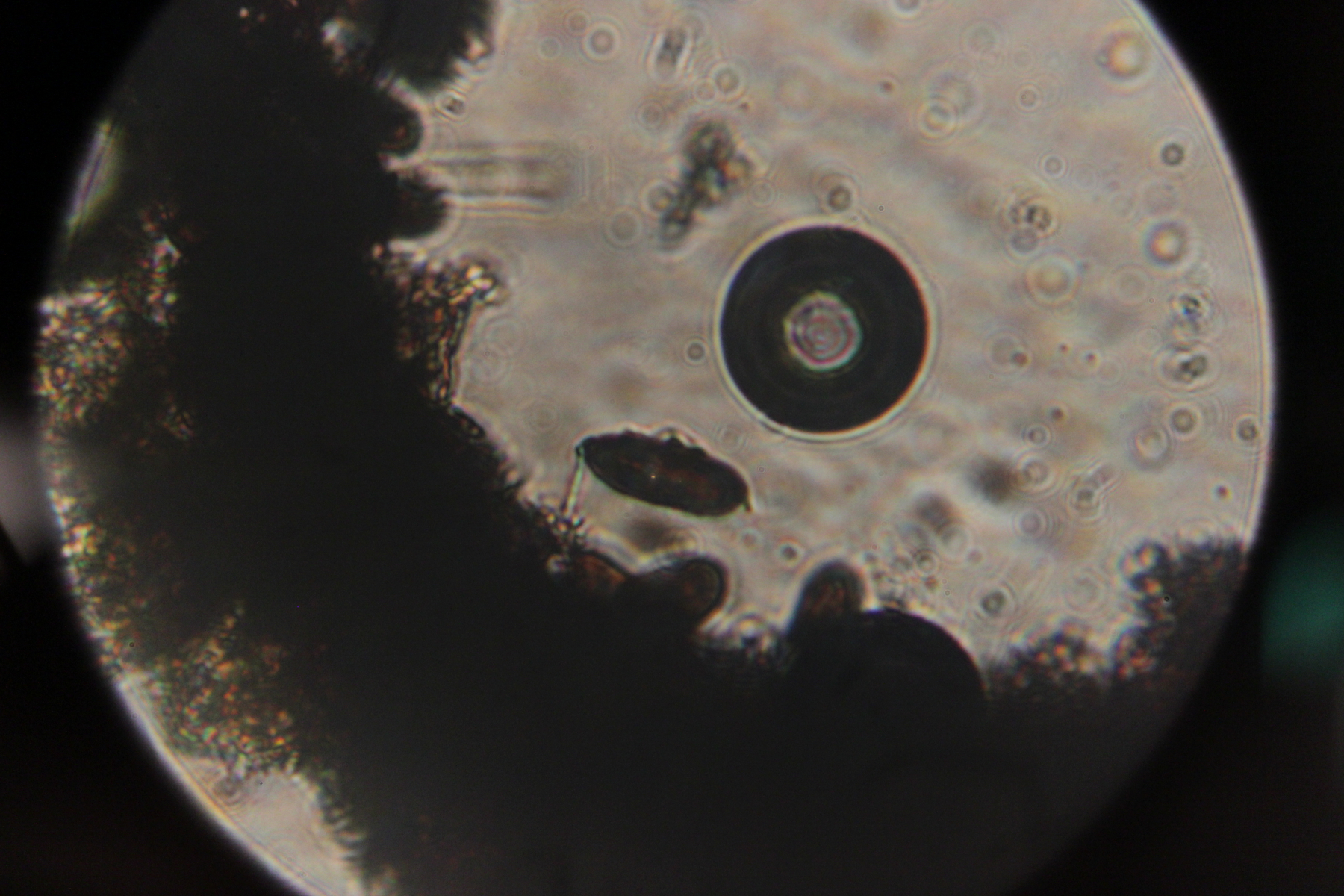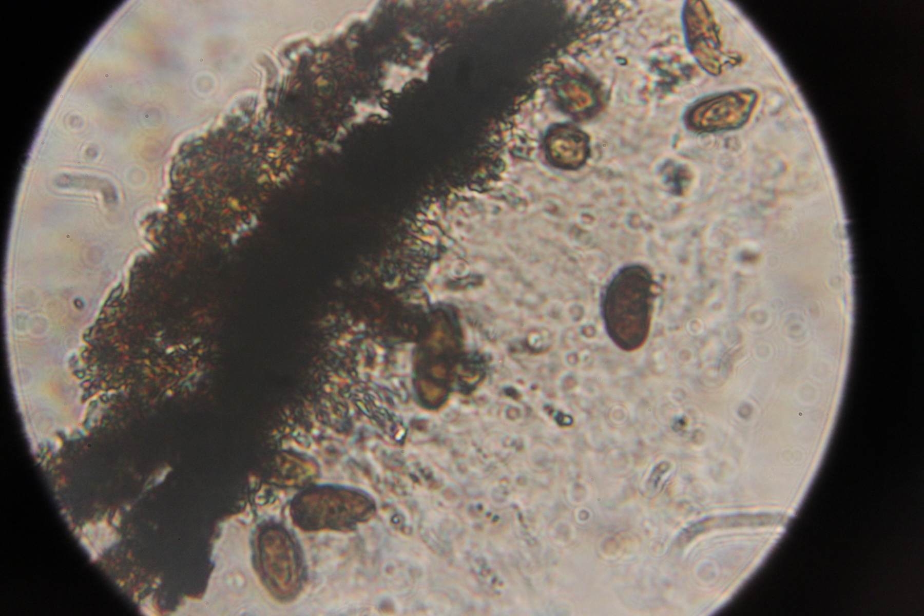 Auf den Bild sieht man die recht kleine würstformige Sporen und oben Recht ins Bild sieht man wie die Hyphen sich mit KOH irgendwie auflösen.