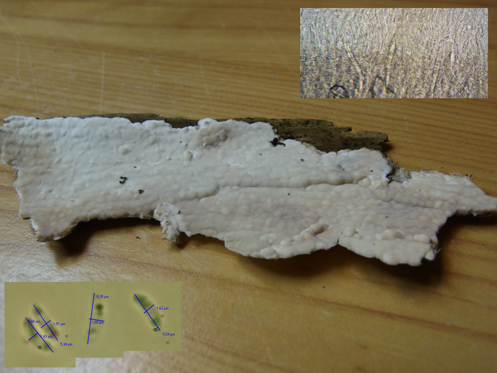 Wenn die 9 große Sporen hatte, wären natürlich mit dem makroskopischen Aussehen Peniophorella und Hyphoderma im Geschäft. Aber wenn die kleinen Schnecken schon nahezu alles aufgegessen haben, ist es natürlich müßig. An den Sporen alleine kann man da auch kaum eine Bestimmung festmachen.