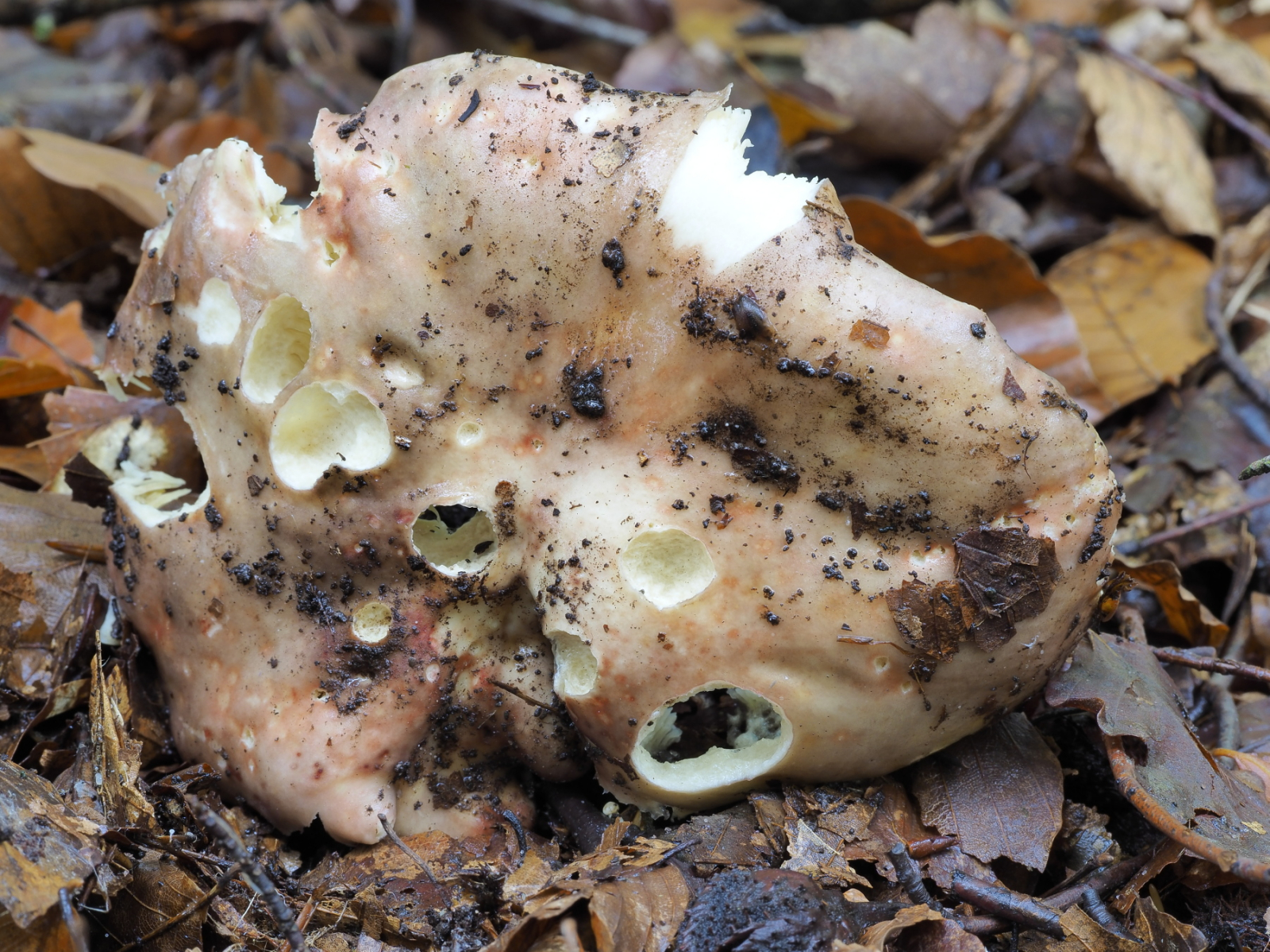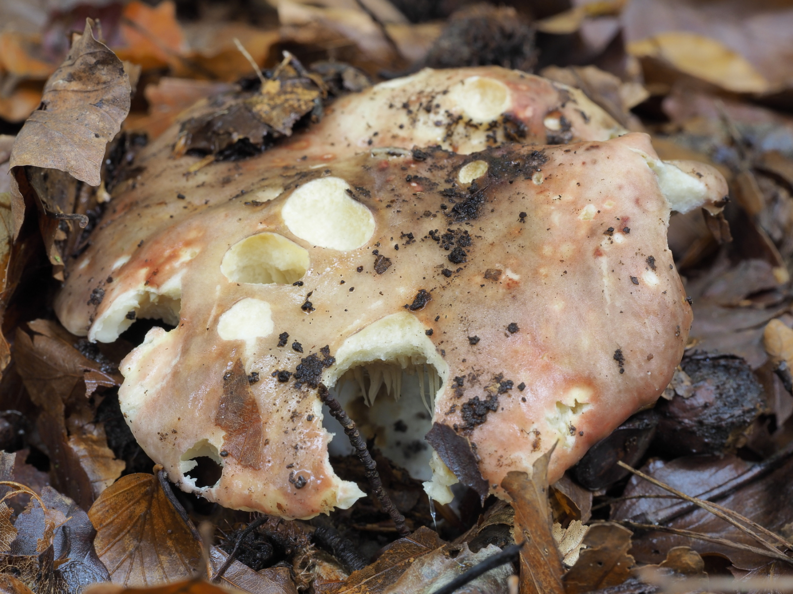 2) Hutoberfläche rötlich fleckend mit rundlichen "Frass-Stellen", sehr Schmutz-anhaftend, Huthaut max 1/3 abziehbar, darunter weiss