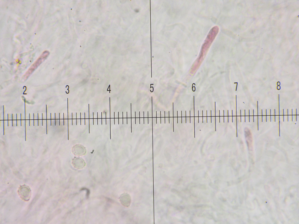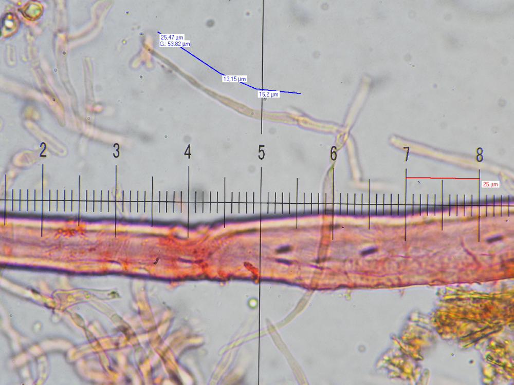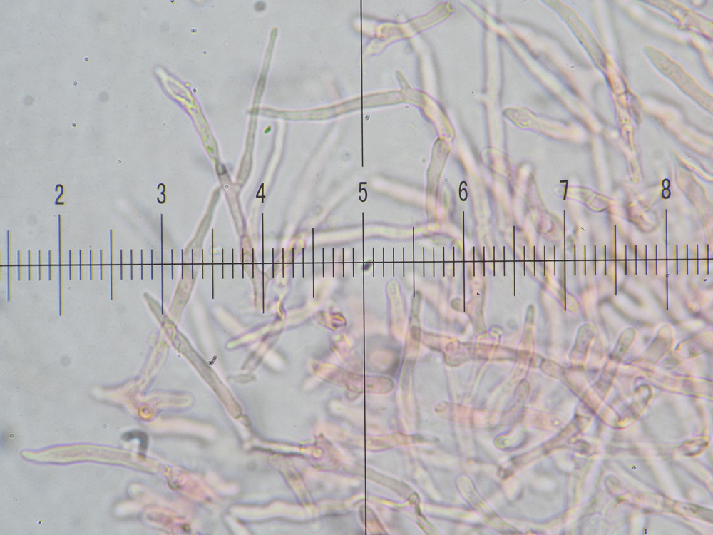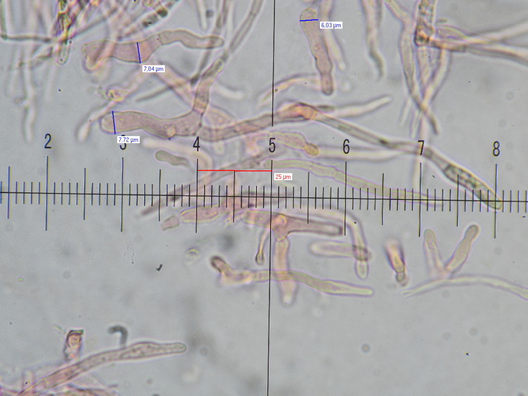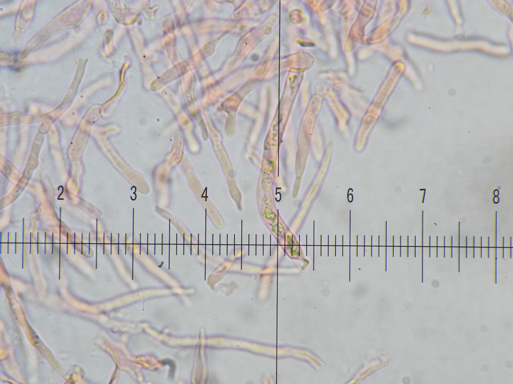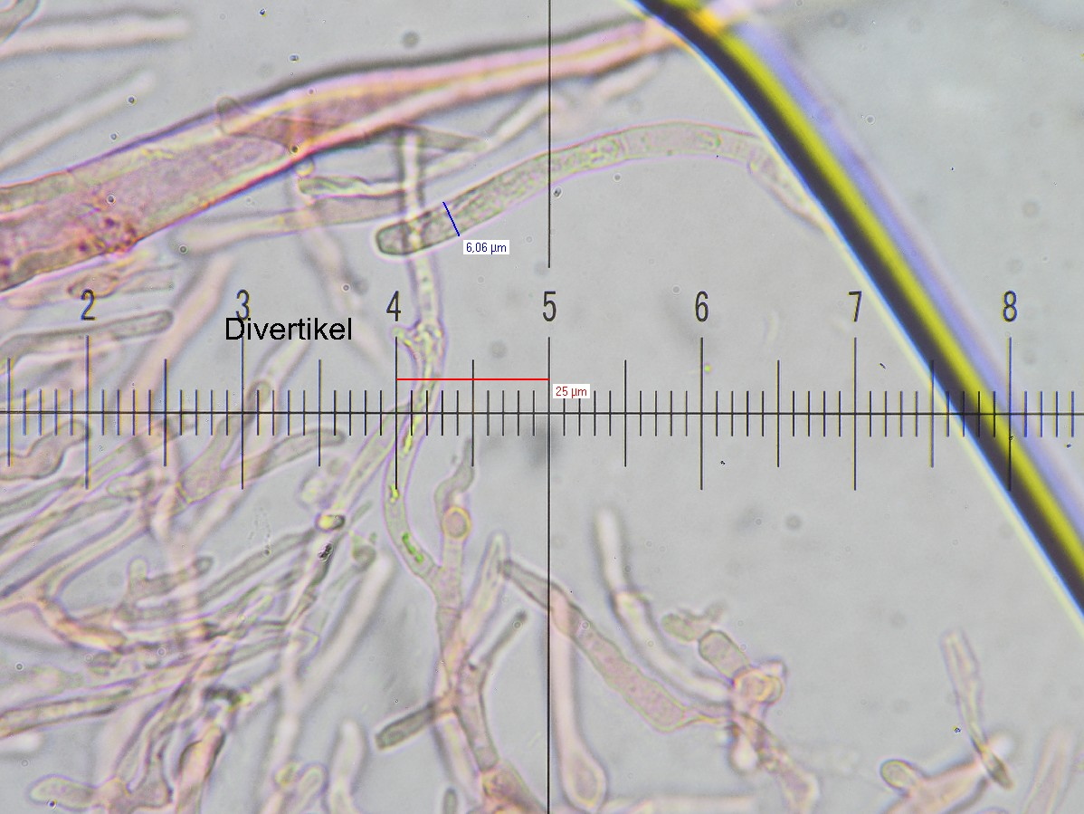 HDS: Pileozystiden vorhanden, zylindrisch, leicht keulig, Divertikel, septiert, bis 6 µm breit