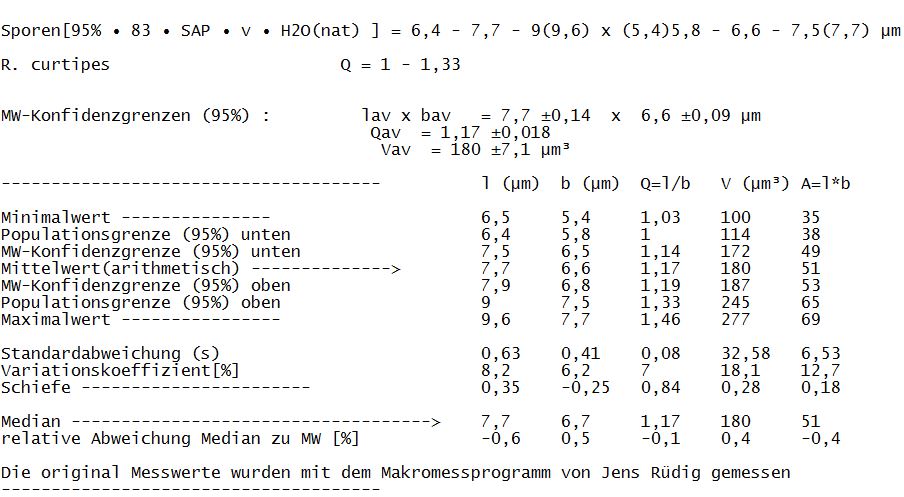 SPOREN: Sporen[95% –• 83 –• SAP –• v –• H2O(nat) ] = 6,4 - 7,7 - 9(9,6) x (5,4)5,8 - 6,6 - 7,5(7,7) µm