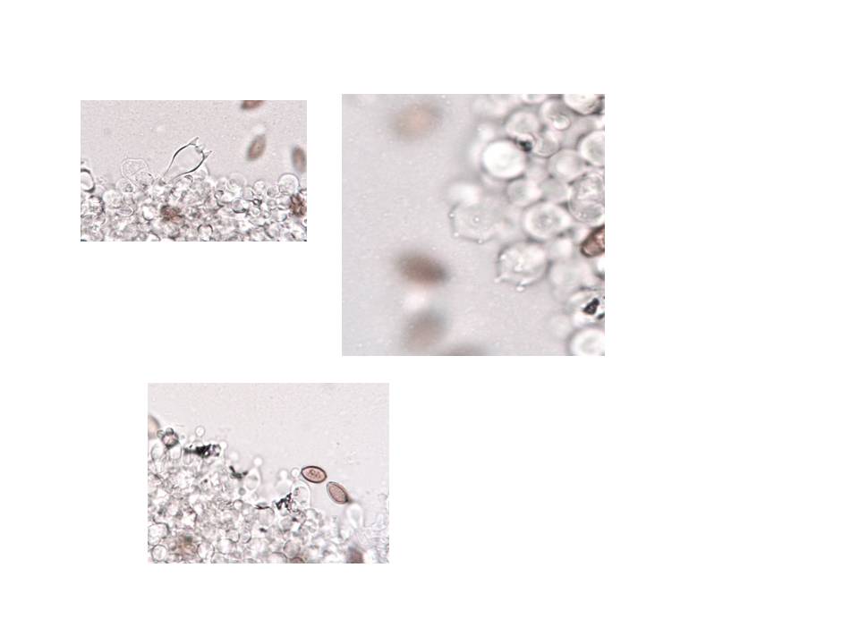 Ich bin mir da aber nicht sicher, ob die da dazu gehört. Es waren auch noch andere, sehr kleine bohnenförmige Sporen zu sehen, die ich aber leider nicht scharf auf ein Foto bekommen habe.Sehr eigenartige Zystiden(?) habe ich gefunden und auch zwei Kristalle. Letztere könnensicher auch woanders herkommen.