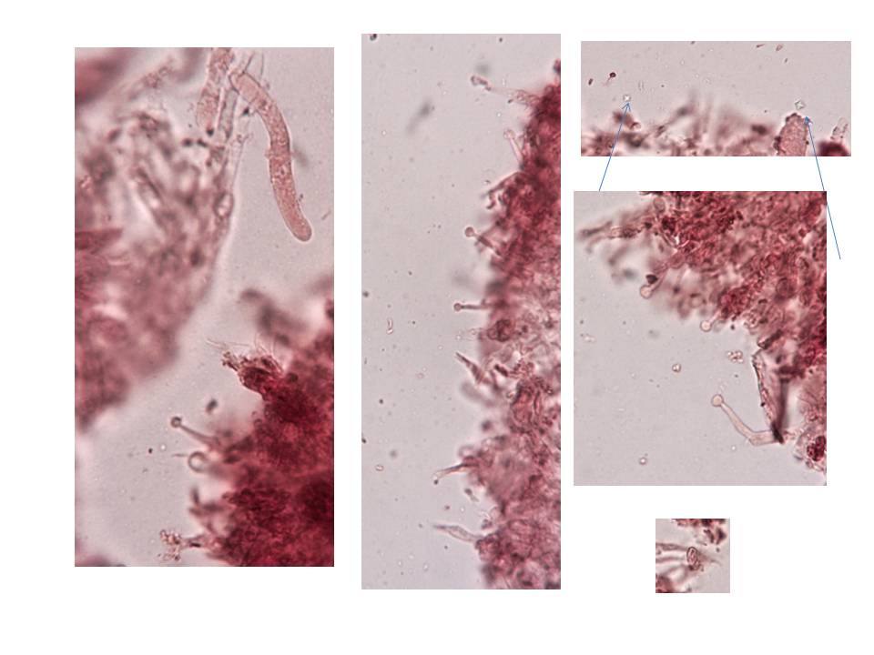 Ich bin mir da aber nicht sicher, ob die da dazu gehört. Es waren auch noch andere, sehr kleine bohnenförmige Sporen zu sehen, die ich aber leider nicht scharf auf ein Foto bekommen habe.Sehr eigenartige Zystiden(?) habe ich gefunden und auch zwei Kristalle. Letztere könnensicher auch woanders herkommen.
